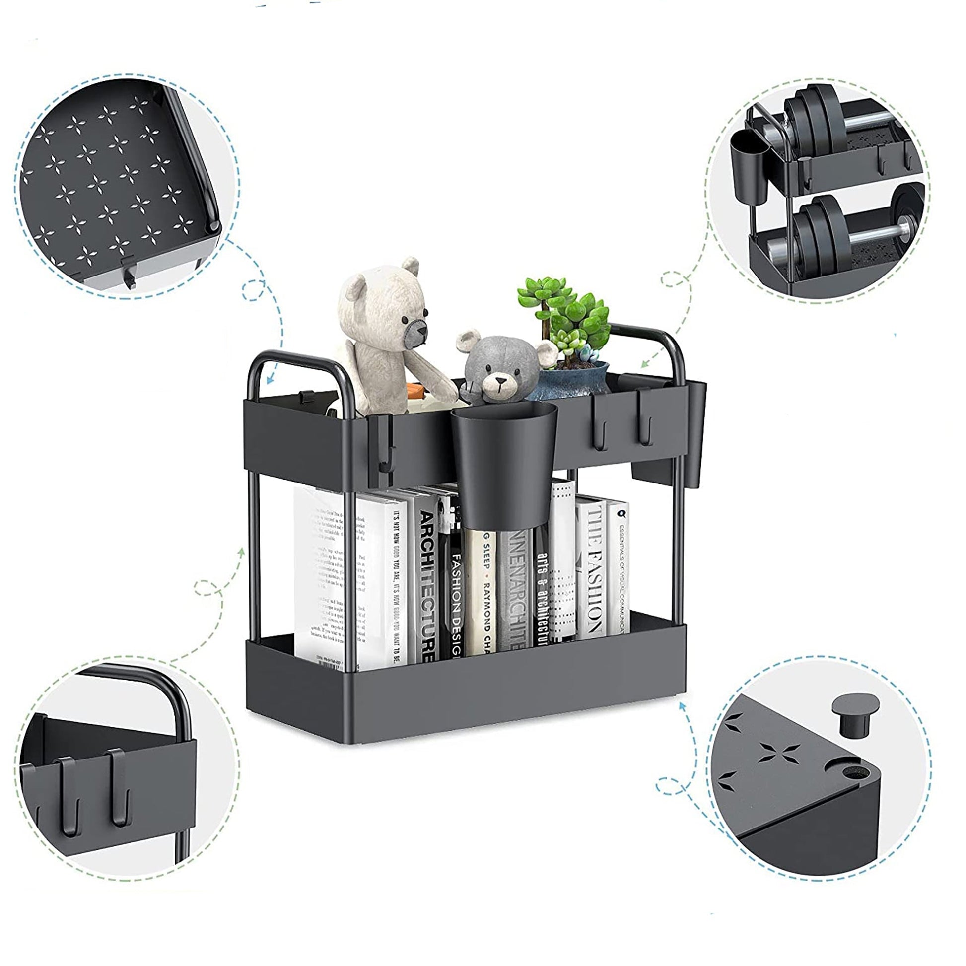 2 Tier Rack Shelf Storage Organizer with 4 Hooks 2 Hanging Cups - Black
