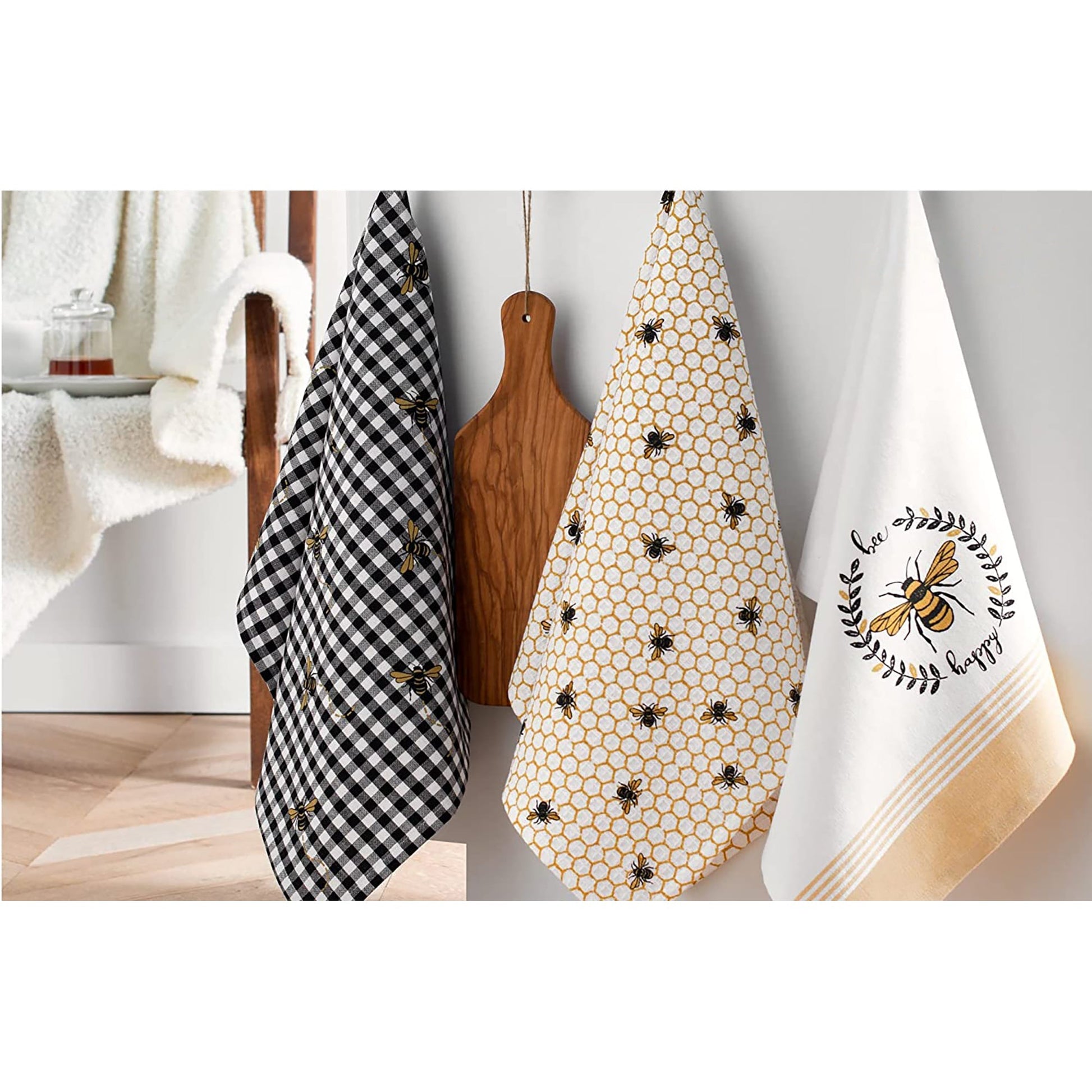 -This statement assorted kitchen towels are made from premium quality cotton and feature crisp kitchen towels with Bee Happy phrase and coordinating honeycomb prints with honey bees to create the best Farmhouse look.