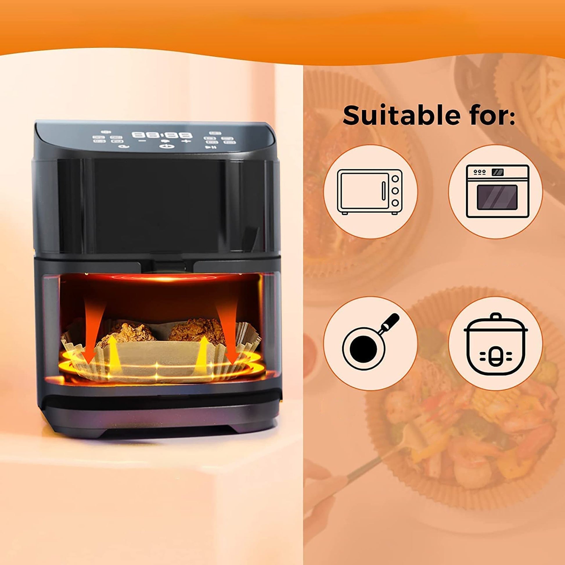 -Multiple Use: Suitable for an air fryer, microwave, oven, steamer, cooker, etc. The paper liners can be applied for baking, roasting, frying, or serving food, suitable for home baking, camping, BBQ, summer party, and so on.