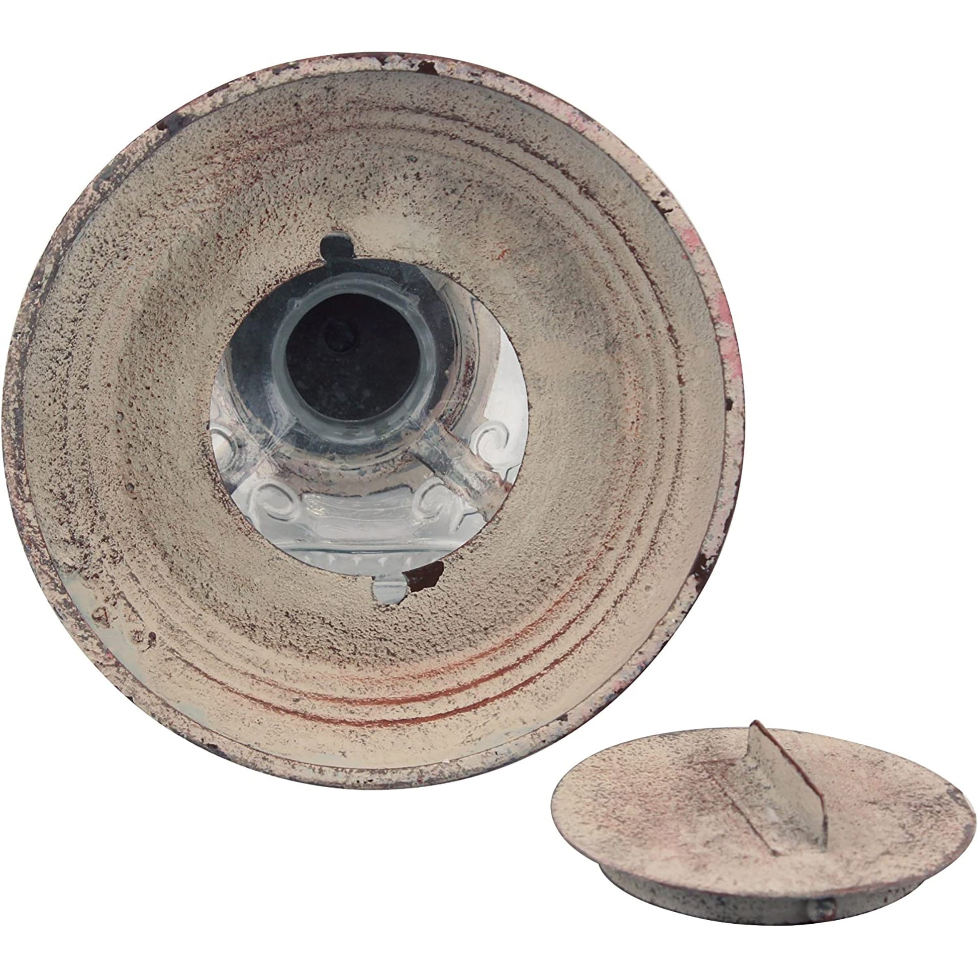 -Metal cafe lantern is durably made with worn white painted metal with rust highlights round pressed glass cover and is safe to use indoors or outdoors.