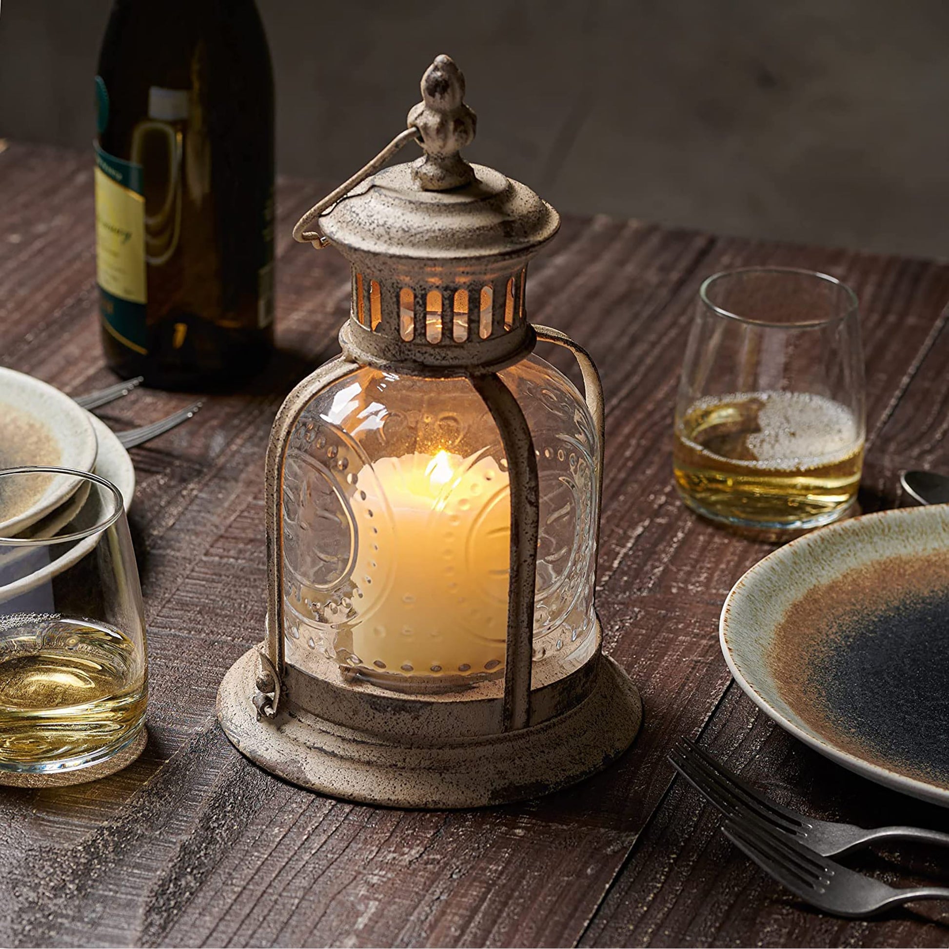 -Our antique white metal lantern is made with beautifully distressed white painted metal with rust highlights, a round pressed glass cover, and a sturdy metal top, so you can enjoy your lantern indoors or outdoors.