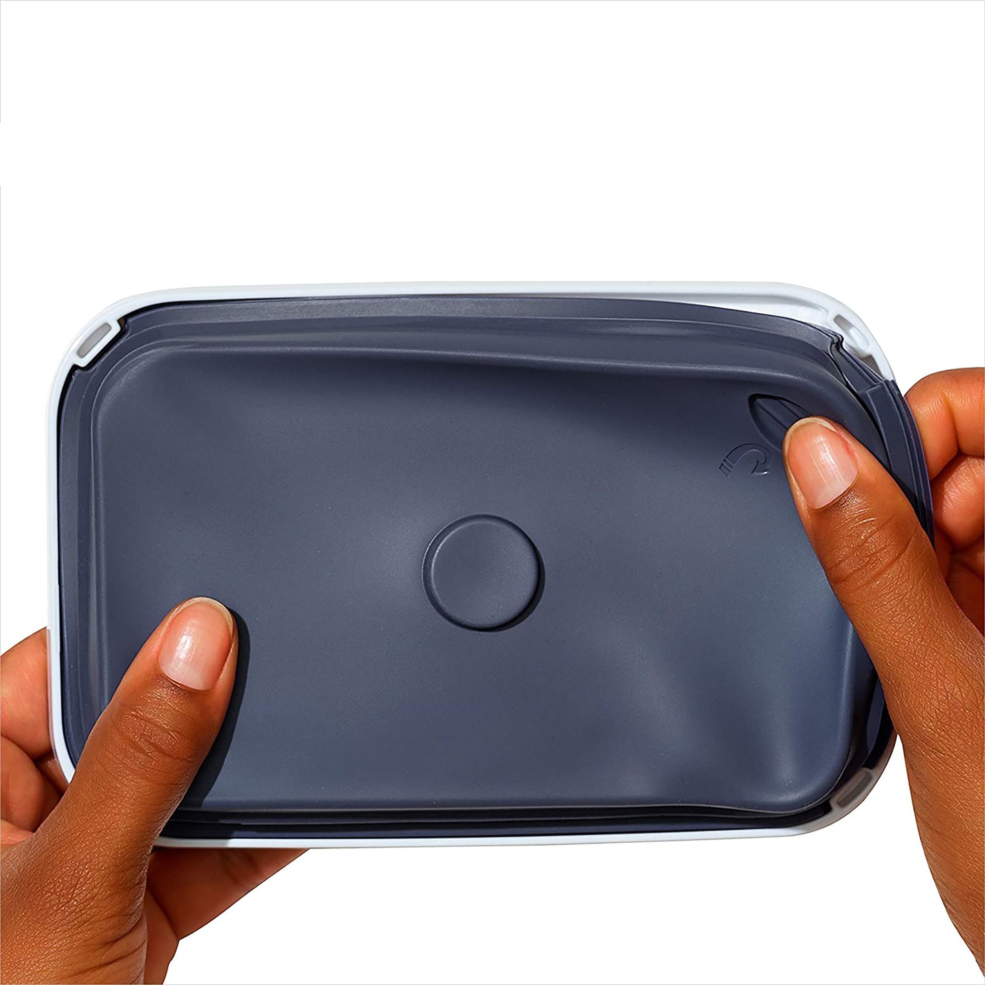 -Push the button to engage the airtight seal. The button doubles as a handle for the lid. For best results, always use the button to open and close.