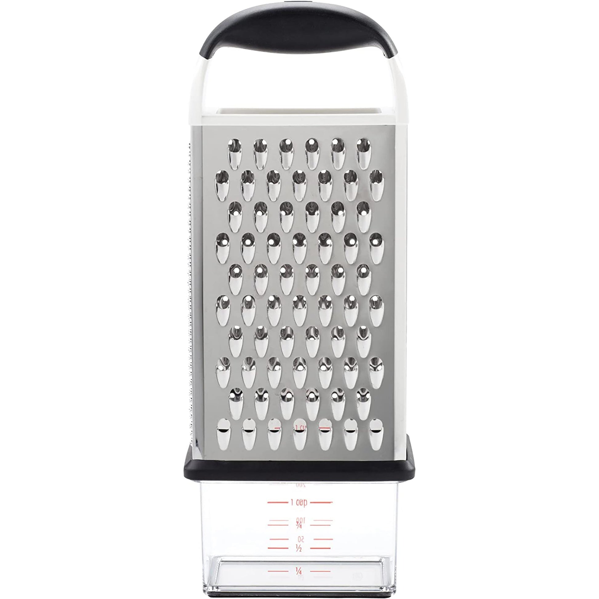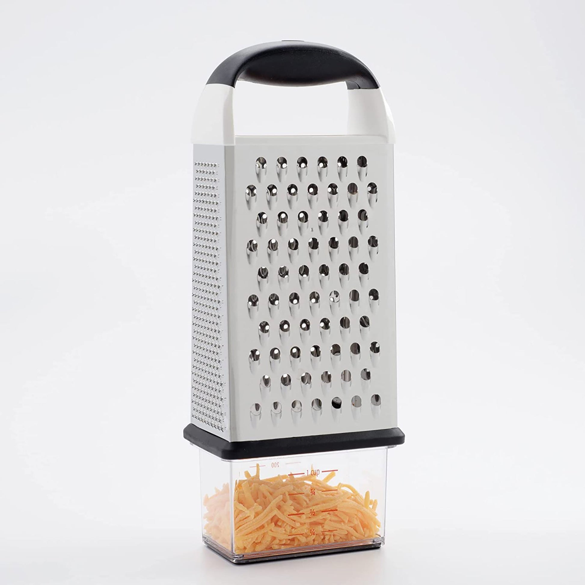 - This box grater features 4 stainless steel surfaces: 2 wide ones for coarse and medium grating and 2 slimmer ones for fine grating and slicing. A convenient container with a non-slip base, measurement markings, and lid attaches to the bottom for catching and storing freshly grated ingredients.