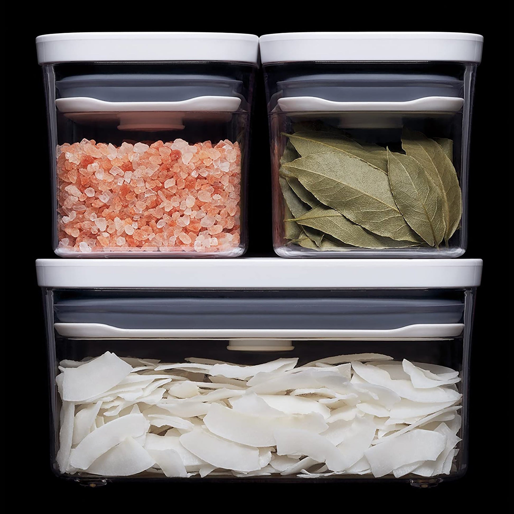 -Pop Starter Container Set is made to stack together and features a push-button airtight seal, they are carefully calibrated to keep everyday household staples like flour, sugar, coffee, cereal, oatmeal, coffee, grains, pasta, and spices fresh and close at hand.