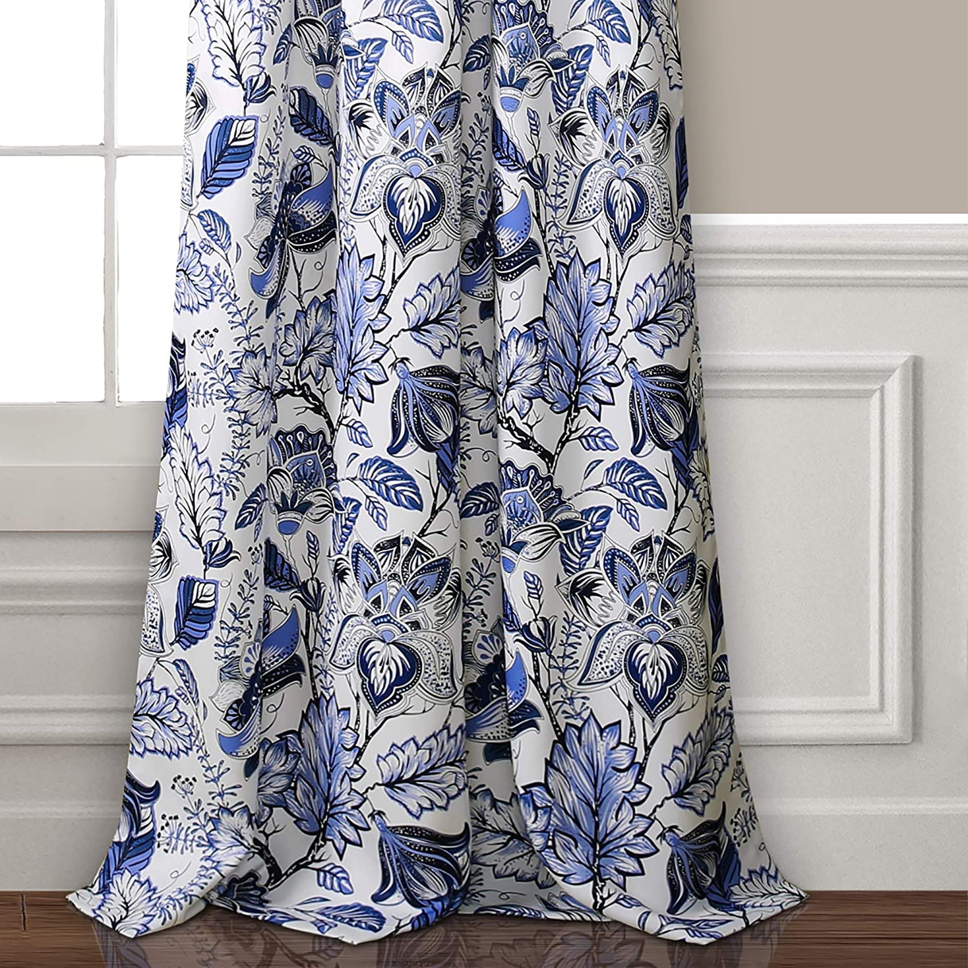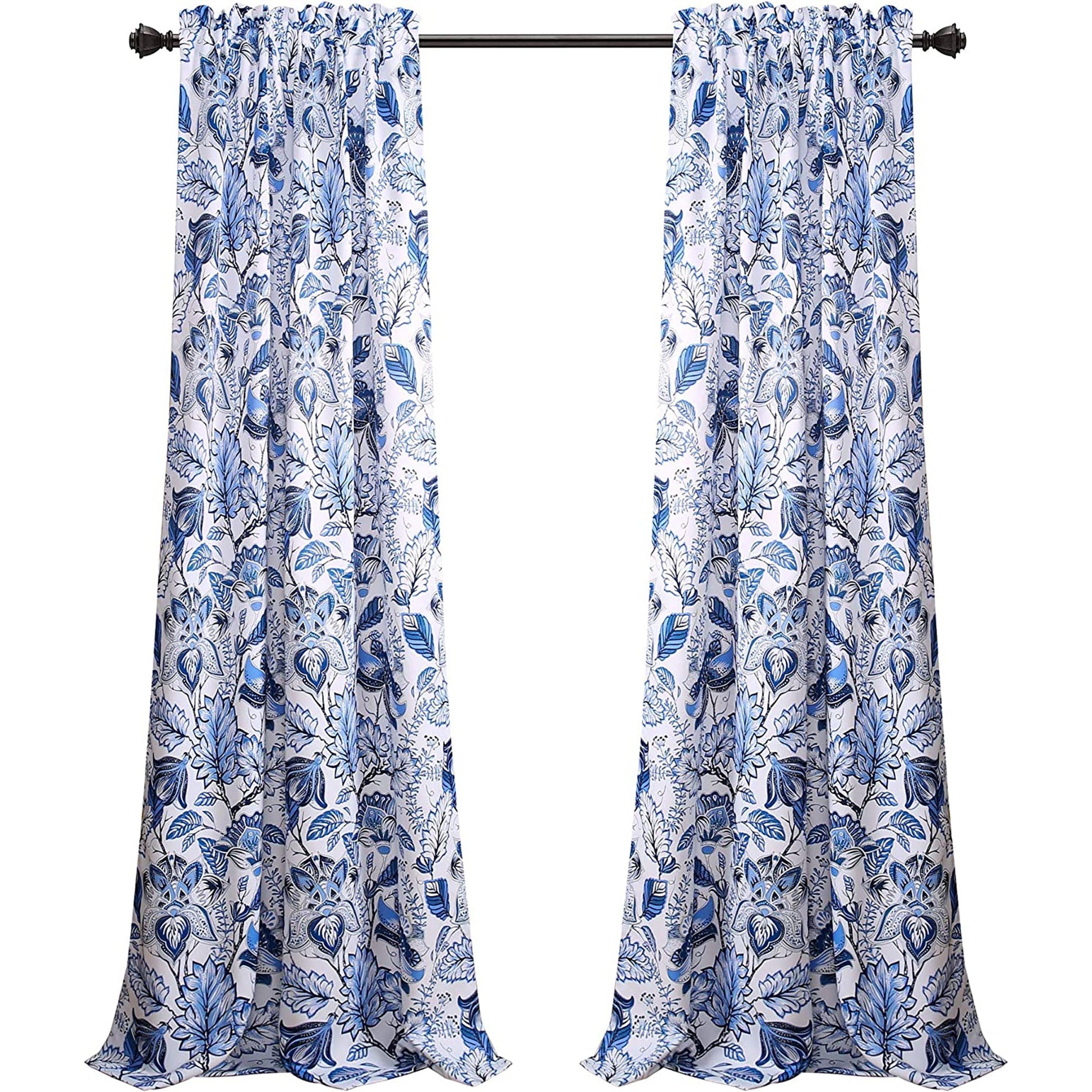 -Stylish and unique set of curtain panels with a blue Jacobean floral design throughout.