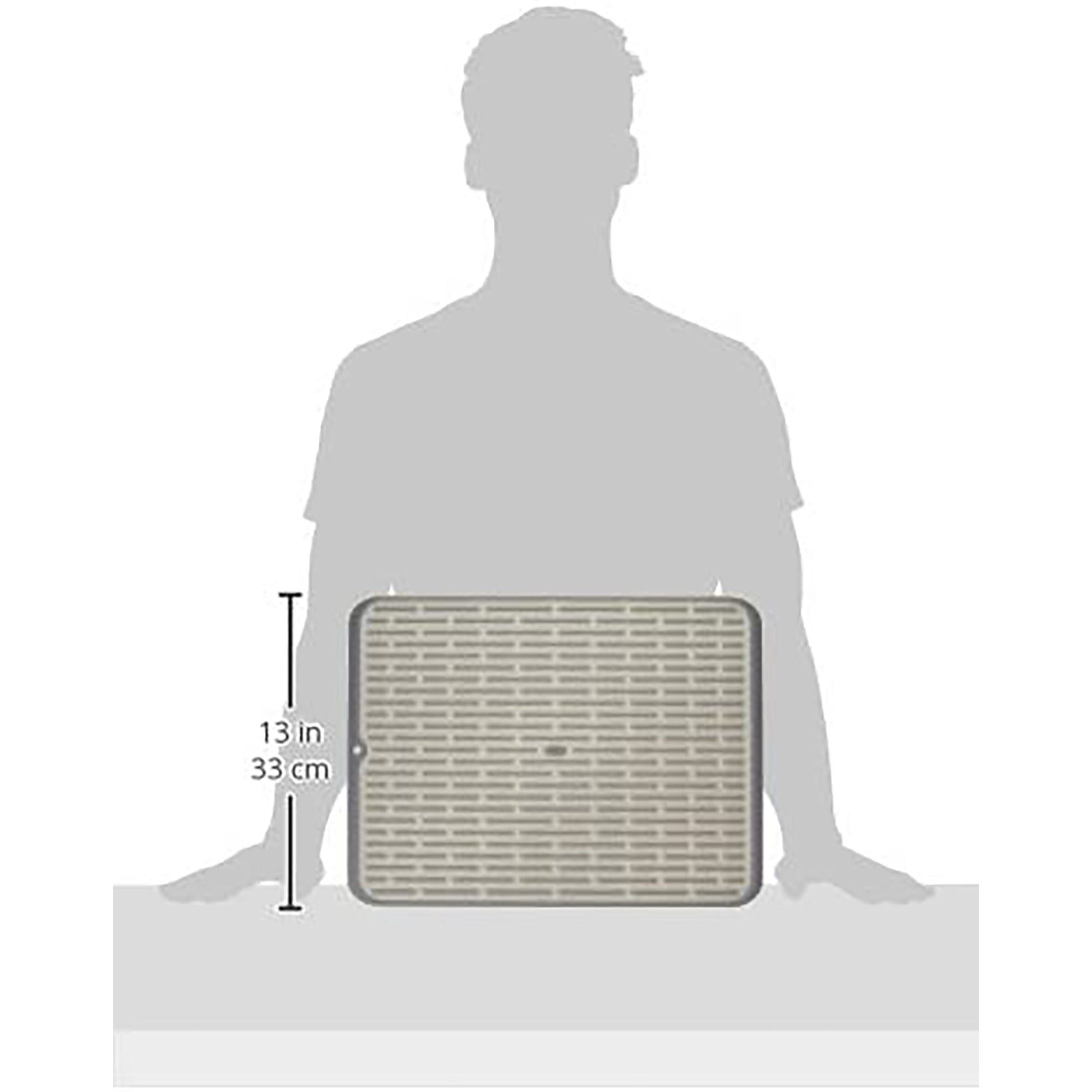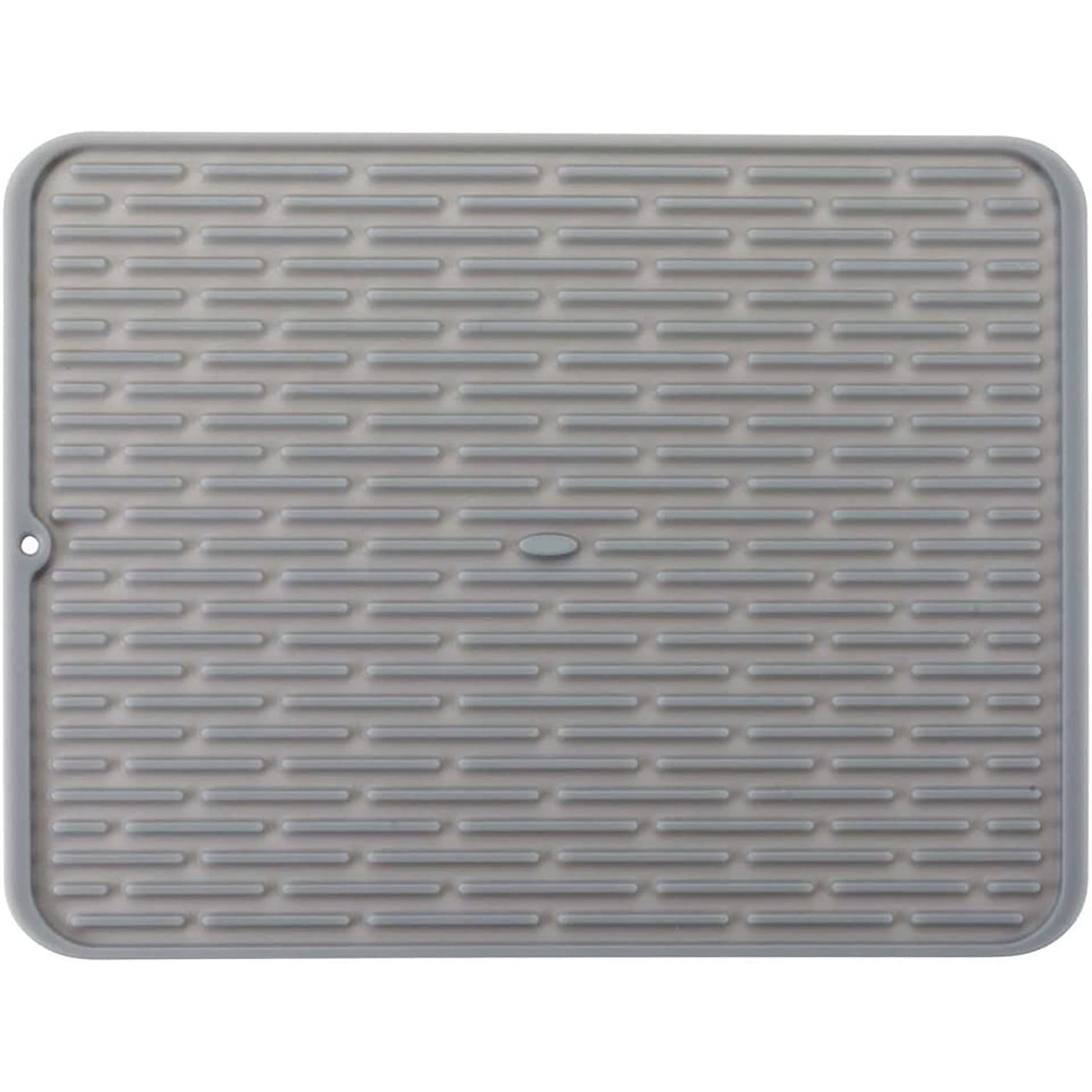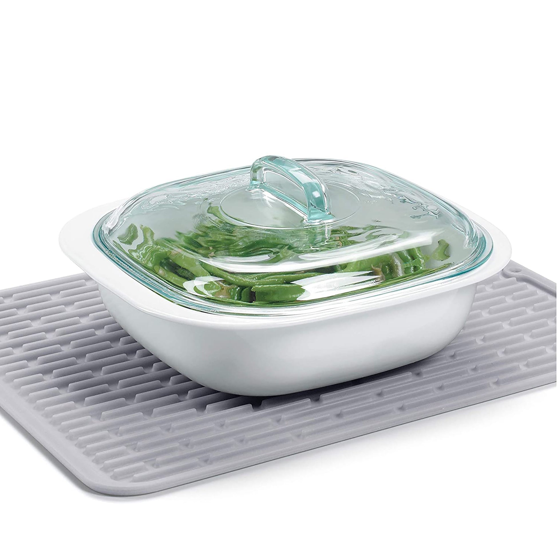 -Efficiently dry large and delicate items with the large silicone drying mat. The Drying Mat has a unique ribbed design that maximizes aeration and elevates items, keeping them clean and sanitary. The large rectangular shape can accommodate a variety of dishes and cookware. Once items are dry, the easy-to-clean Mat can be rolled up or hung for storage. The heat-resistant silicone material allows the Mat to double as a trivet. From the manufacturer