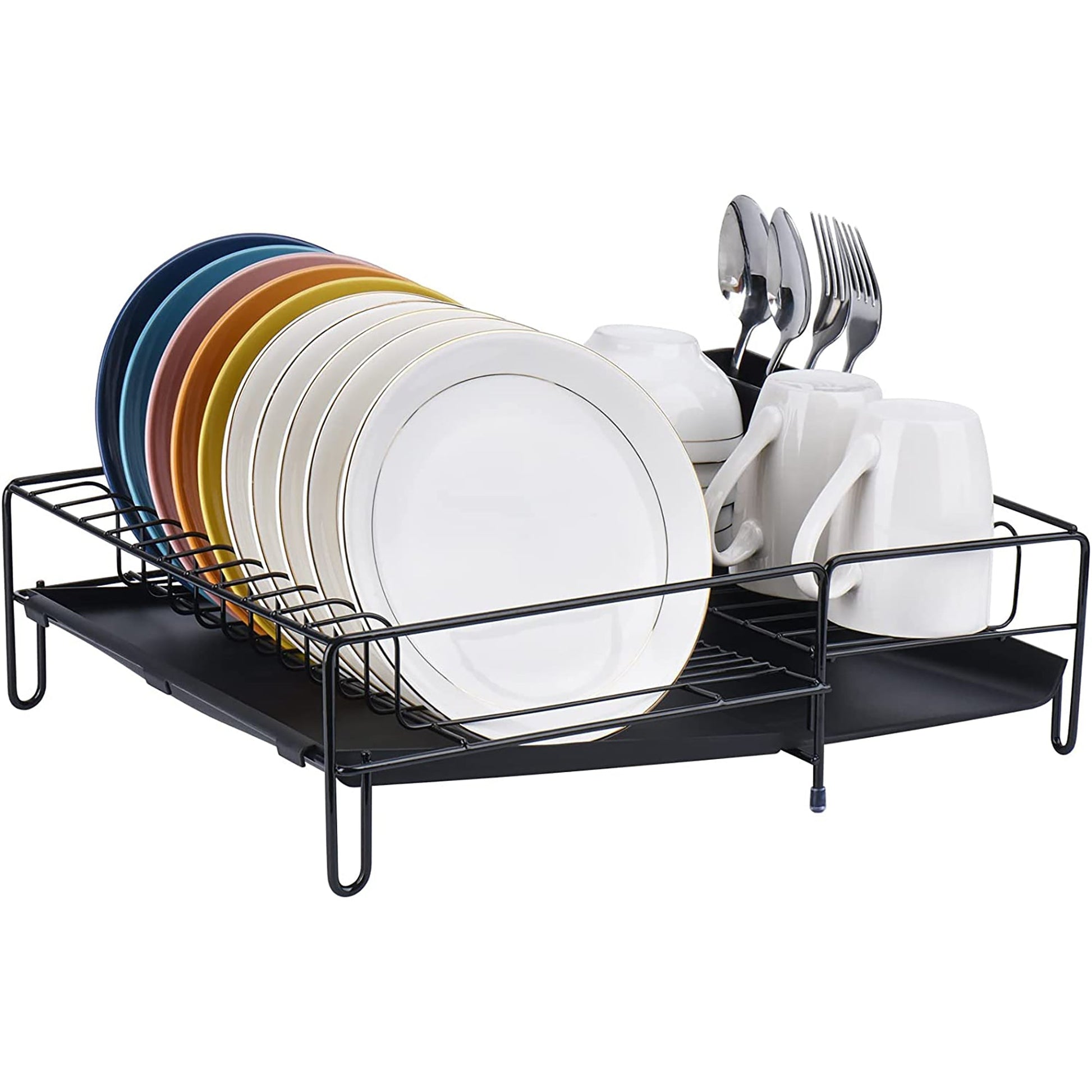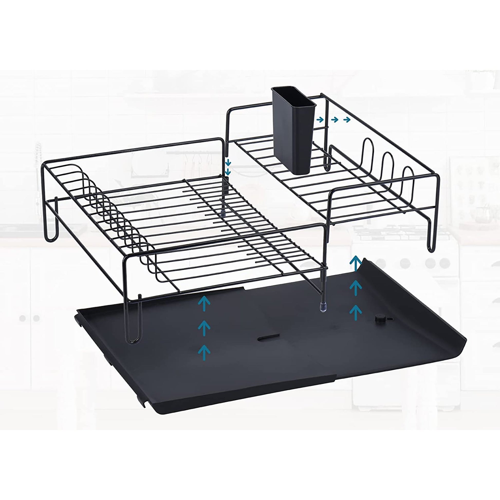 Dish Drying Rack with Drip Tray Cutlery Holder Swivel Draining Spout for Kitchen Countertop - Black