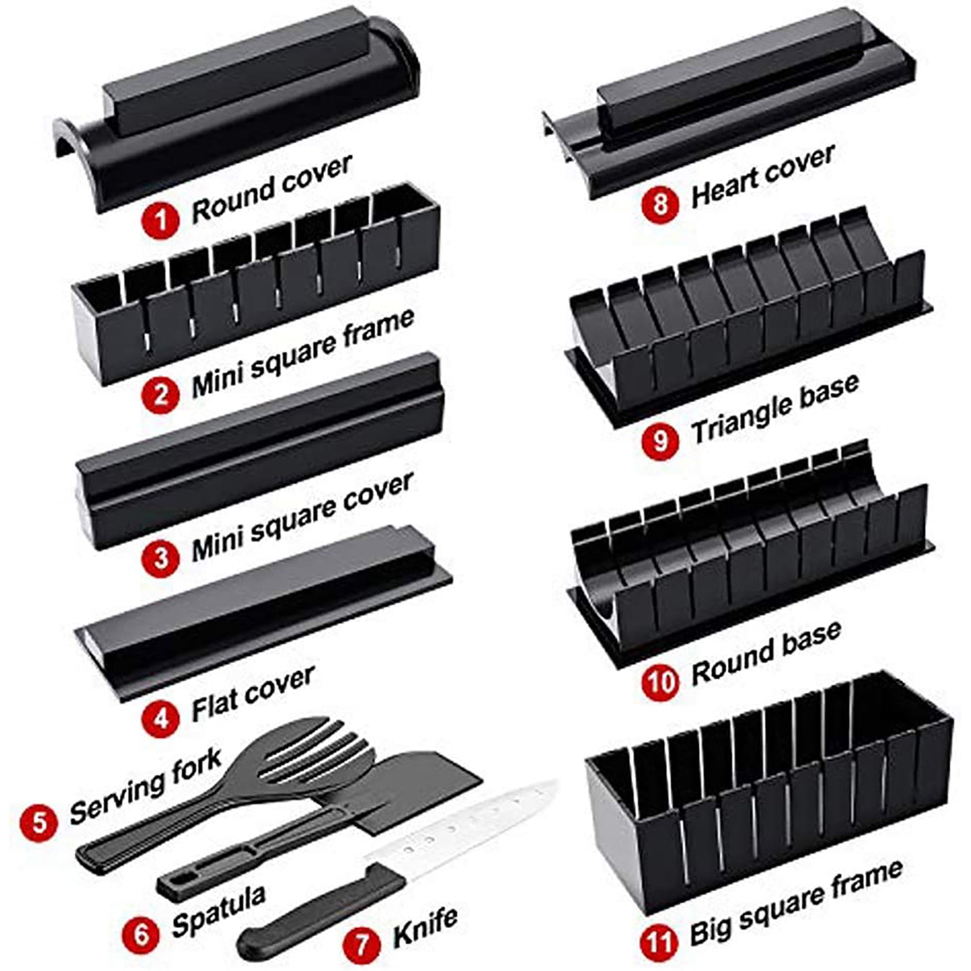 DIY Plastic Sushi Maker with Complete Sushi Set with 8 Sushi Rice Roll Mold 11 Pieces - Black