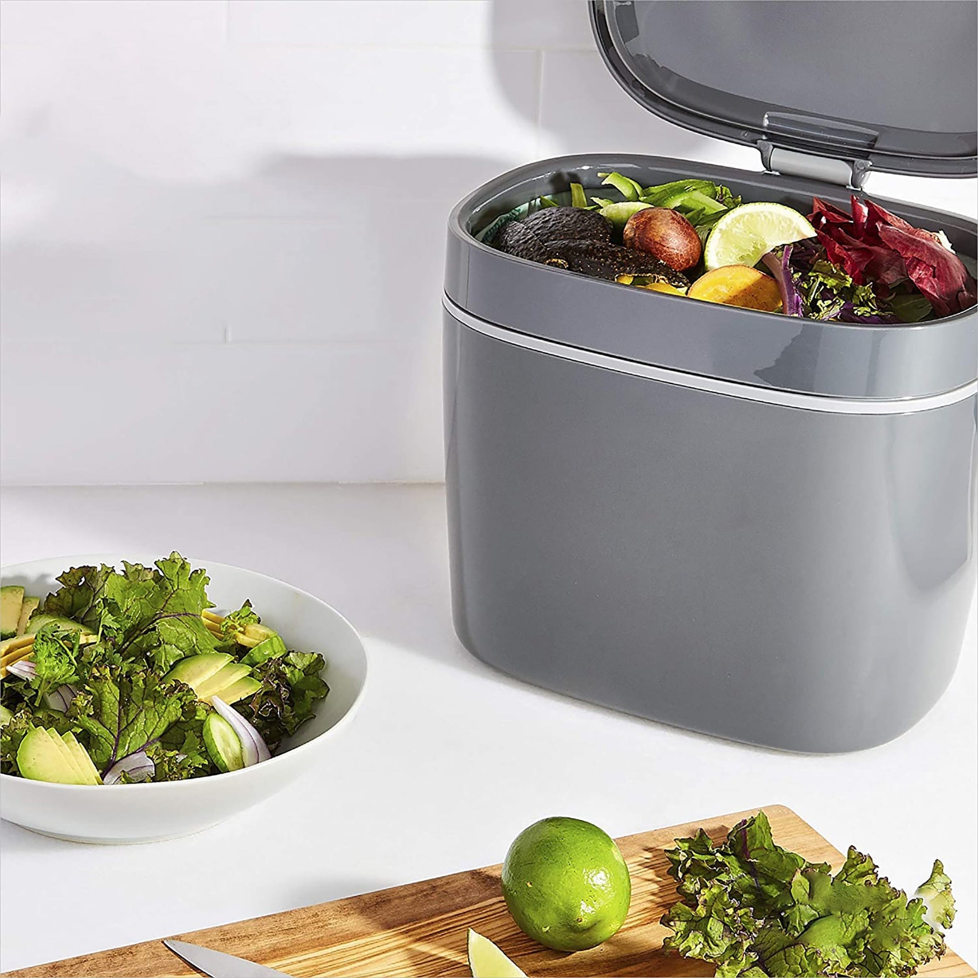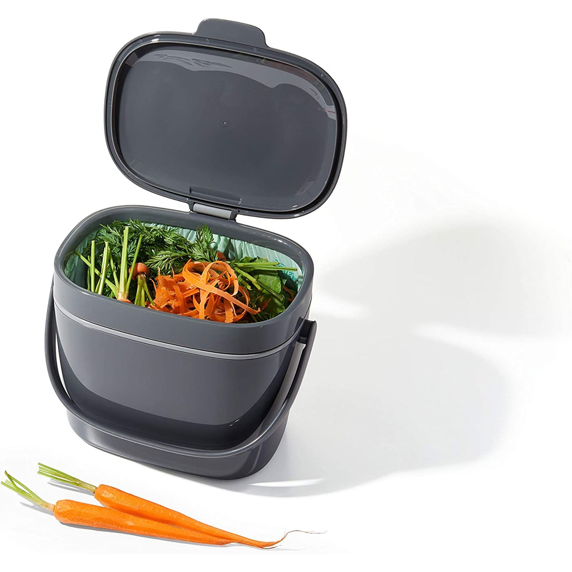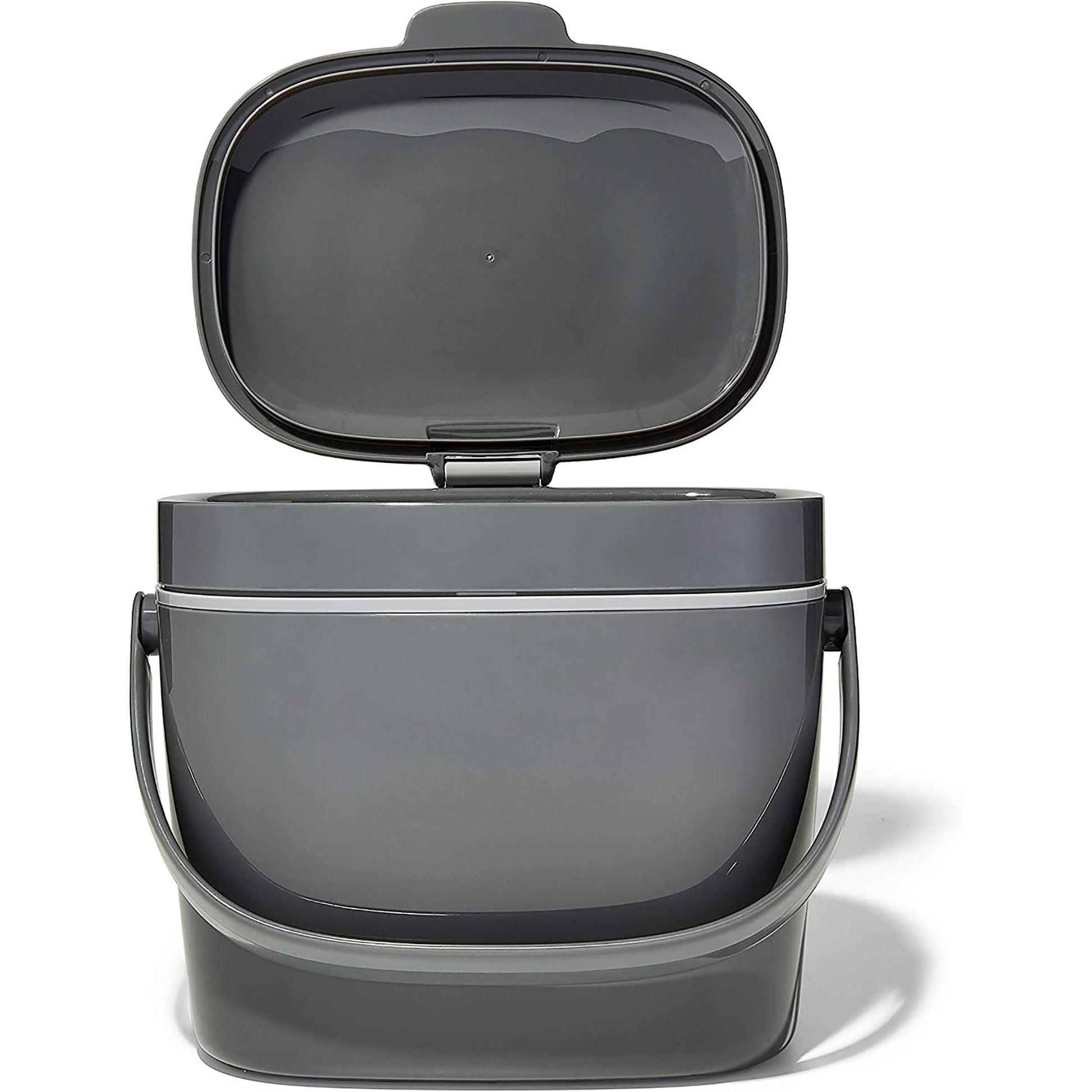 -Uncomplicated composting with this compost bin. Designed to sit on countertops, the bin is designed to keep composting bags tucked inside for a neat look. The 1. 75-Gallon or 6.62-Liter Capacity makes it perfect for culinary creatives, but the easy-to-use, stay-open lid makes it easy for anyone to use. The lid helps keep odors from escaping and the smooth interior makes it a breeze to clean, even if you do not use composting bags. The convenient handle makes transporting the bin easily, and the handle folds down out of the way when not in use. The internal bucket is removable and dishwasher-safe for thorough cleaning.