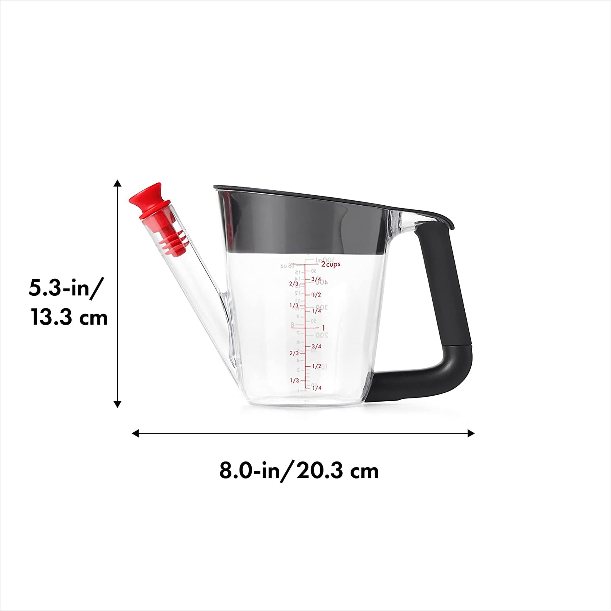 -Making gravy has never been easier with this fat separator. Simply place the stopper in the spout and when you pour pan drippings into the fat separator, the strainer will separate unwanted bits and the fat will rise to the top. Remove the stopper and pour, and the flavorful cooking liquid will come out first, allowing you to leave the fat behind. The measurement markings make following recipes simple, and the splatter shield helps prevent splashing while you pour.