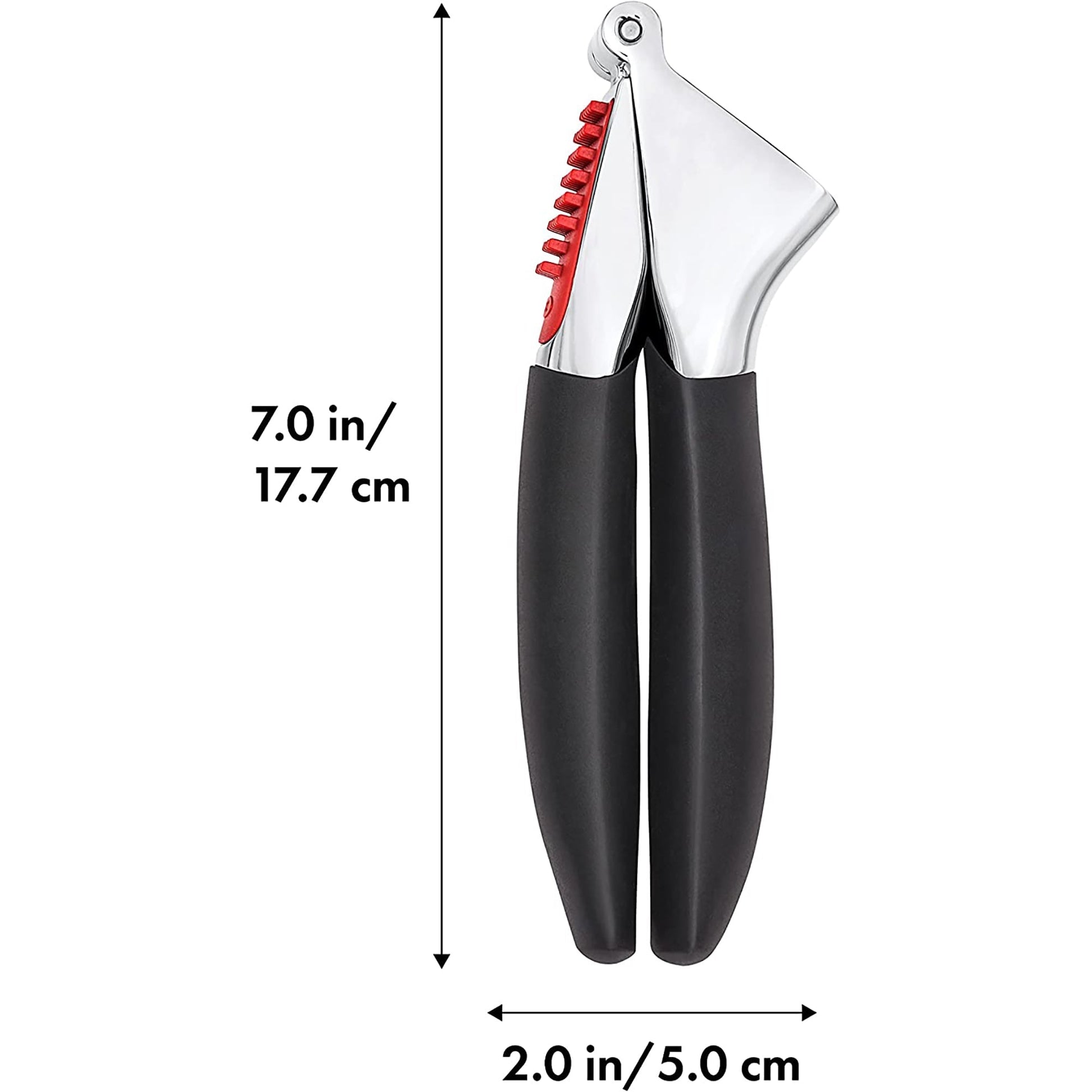 -With sturdy, die-cast zinc construction and a large capacity garlic chamber, the Garlic Press crushes garlic with a simple squeeze. A built-in cleaner allows for easy cleaning. Just flip the handles over to clean out excess garlic.