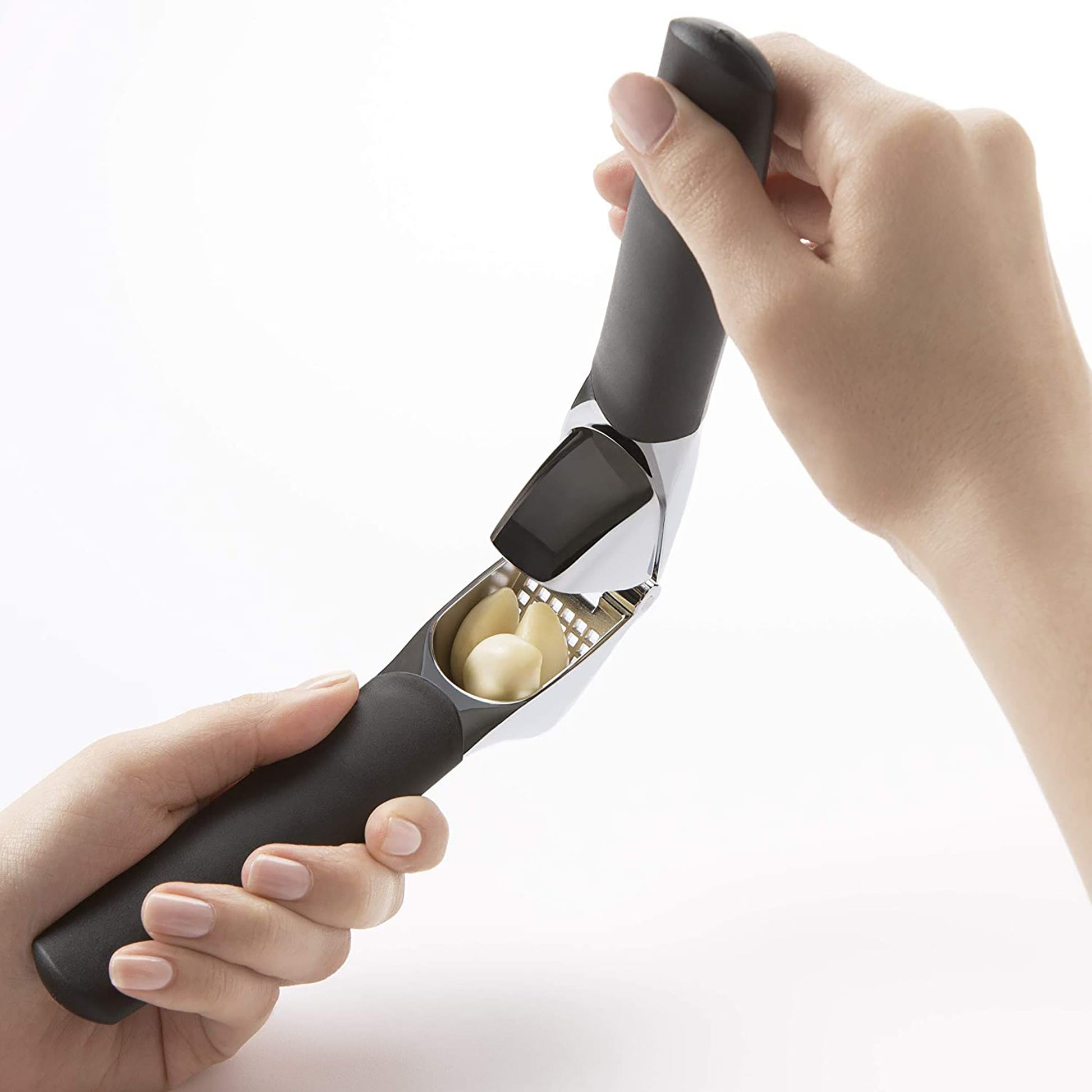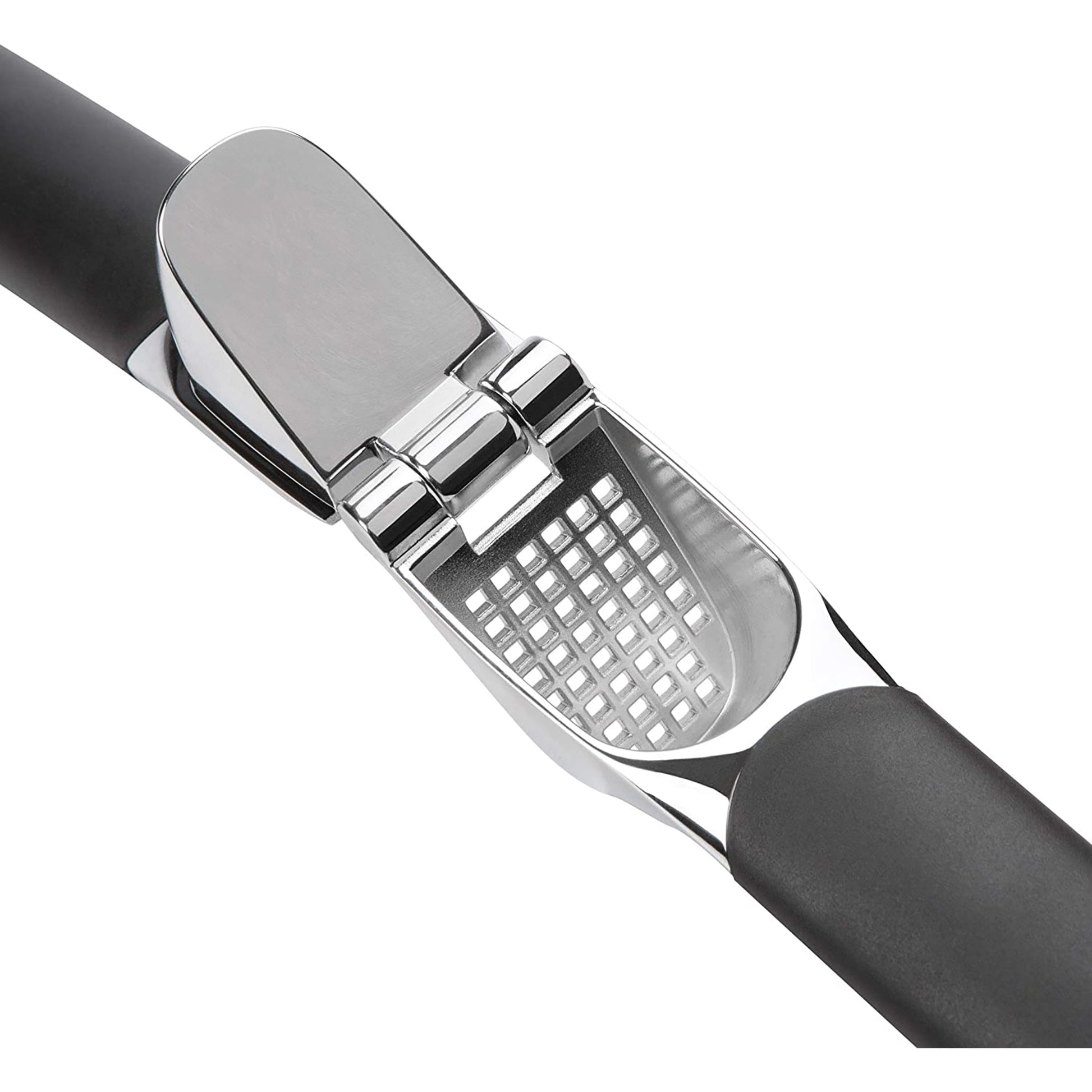-This handy garlic press delivers crushed garlic for your favorite recipes with a simple squeeze of the handles.