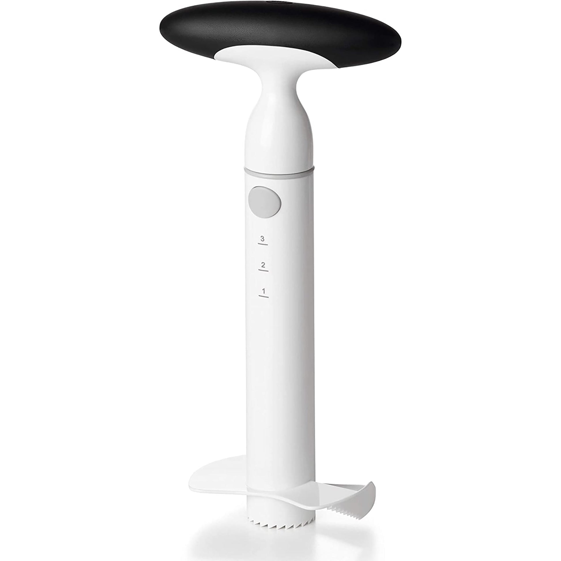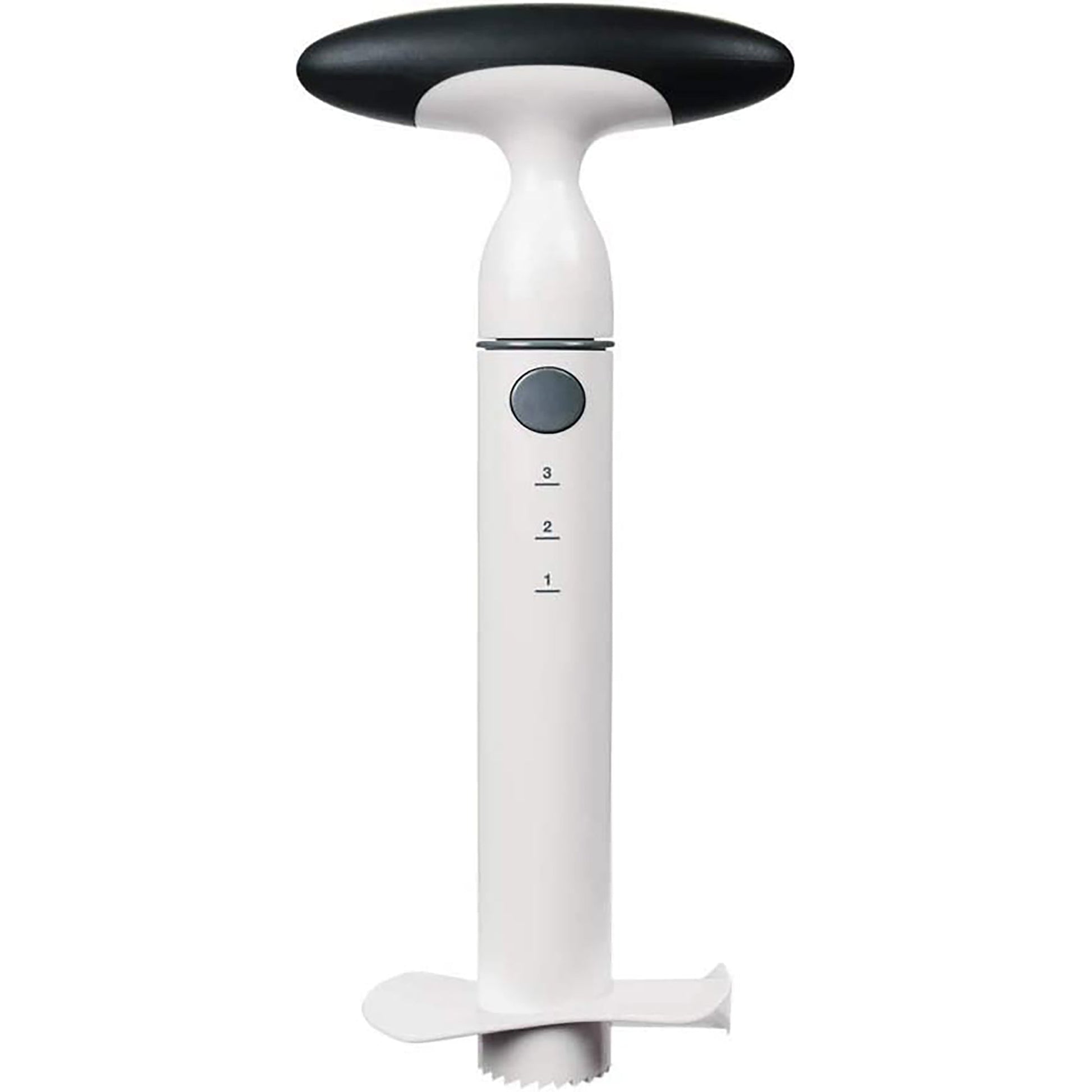 -This pineapple slicer cores and slices a whole pineapple quickly and easily. Simply slice off the top of a fresh pineapple and twist the slicer onto the exposed fruit to create ideal pineapple rings. The ratcheting handle makes it easy to core pineapples quickly without having to remove and replace your hand with each twist. Measurement markings on the slicer determine the height of the pineapple before slicing so you know when the slicer is about to reach the bottom of the fruit. This feature ensures an intact pineapple shell to fill with fruit salad or a festive cocktail if desired. The turning knob features a soft, comfortable, non-slip grip and separates from the shaft for easy cleaning. The sharp, medium-sized blade was designed to accommodate more pineapple sizes and its compact shape makes it easy to store when not in use.