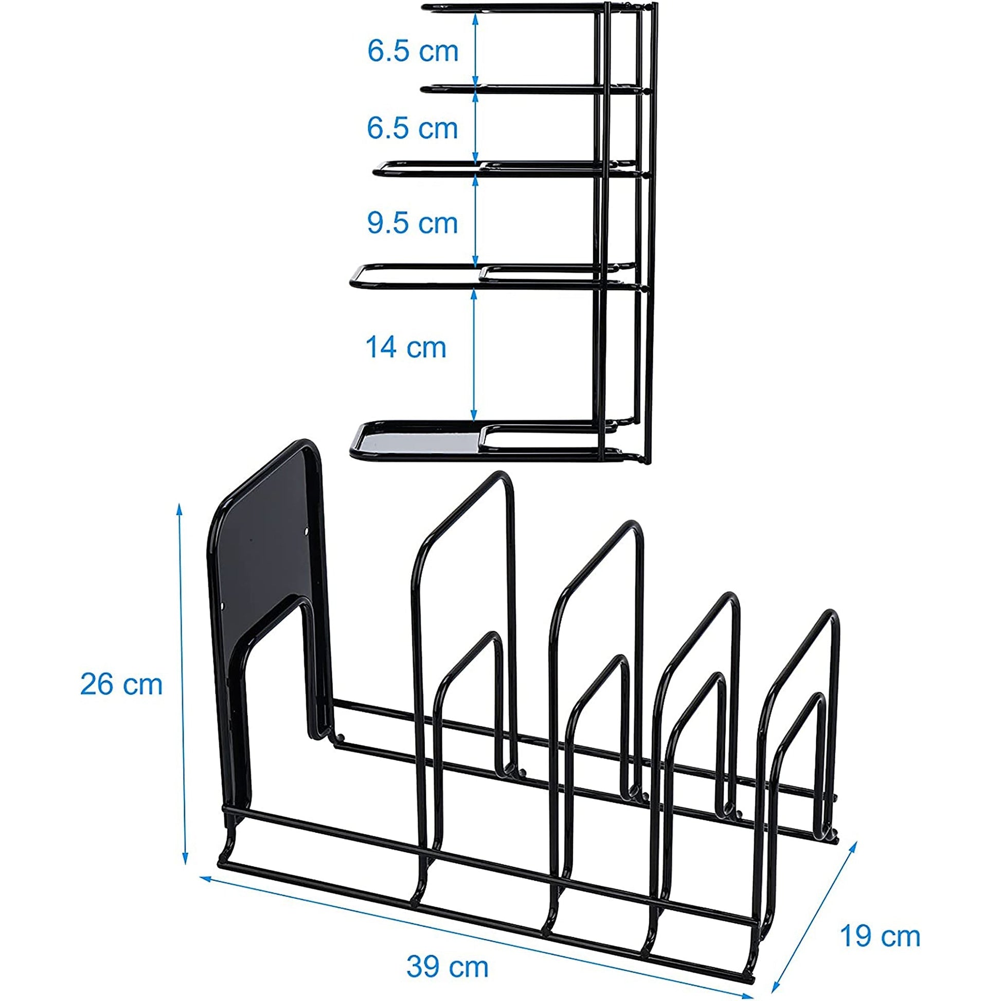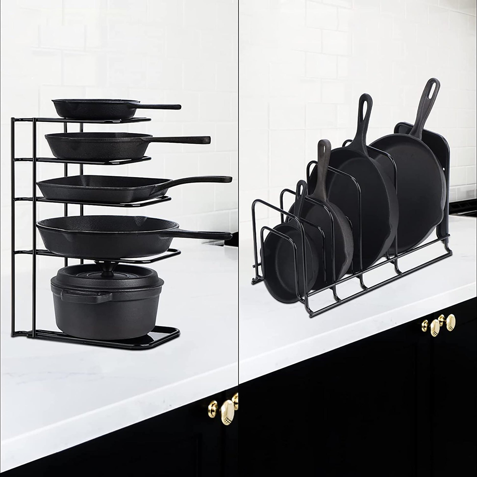 -A 5-tier pot organizer rack, that is made of heavy-duty metal material to hold and organize heavy cookware. It that can easily hold 5 cast iron pans.