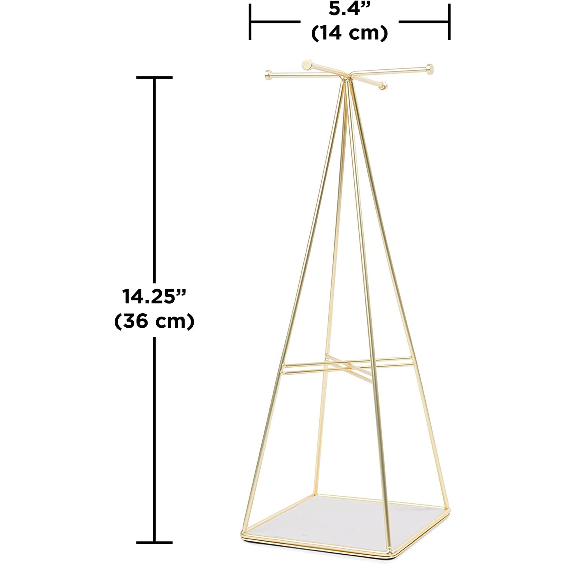-Modern Design: a jewelry display that has been formed into a pyramid shape using metal wire. The spokes at the top are perfect for hanging long necklaces and bracelets and its delicate design allows this jewelry stand and necklace holder to double as decor.