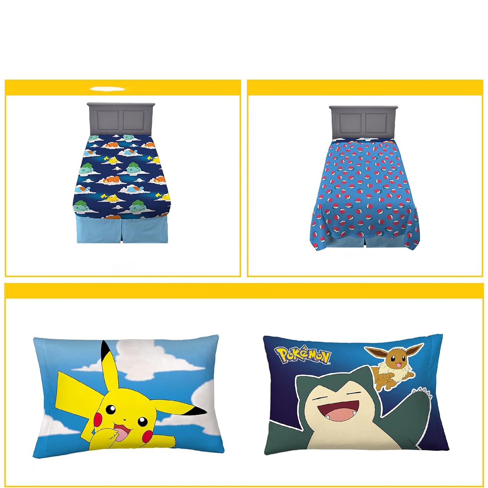 -Pokemon Design: Help your little Pokemon trainers catchem all with this eye-catching sheet set. The colorful "Pokemon Fun" pattern features the Pikachu, Snorlax, Eevee, Squirtle, Charmander, and Bulbasaur characters from the popular Pokemon franchise. With its bold colors and action-packed imagery, this soft and stylish sheet set is sure to be a hit with any Pokemon fan.