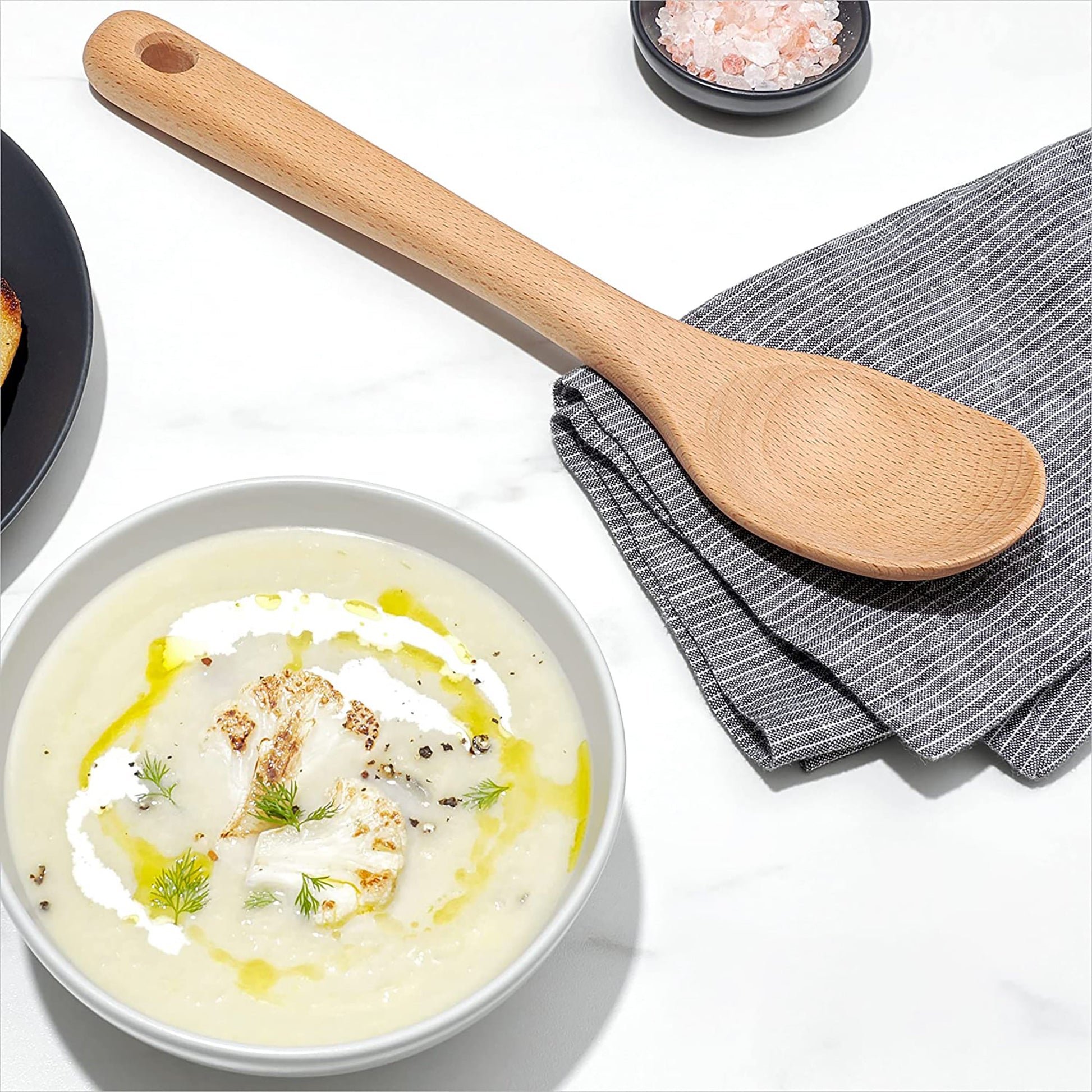 -This wooden large spoon is your go-to tool for stirring soups, chopping ground meat, and serving pasta dishes. With its solid beechwood construction, it is sturdy and safe for non-stick cookware. A natural oil finish protects the wood for durability. The large handle is comfortable to grip and has an opening for neat hanging storage.