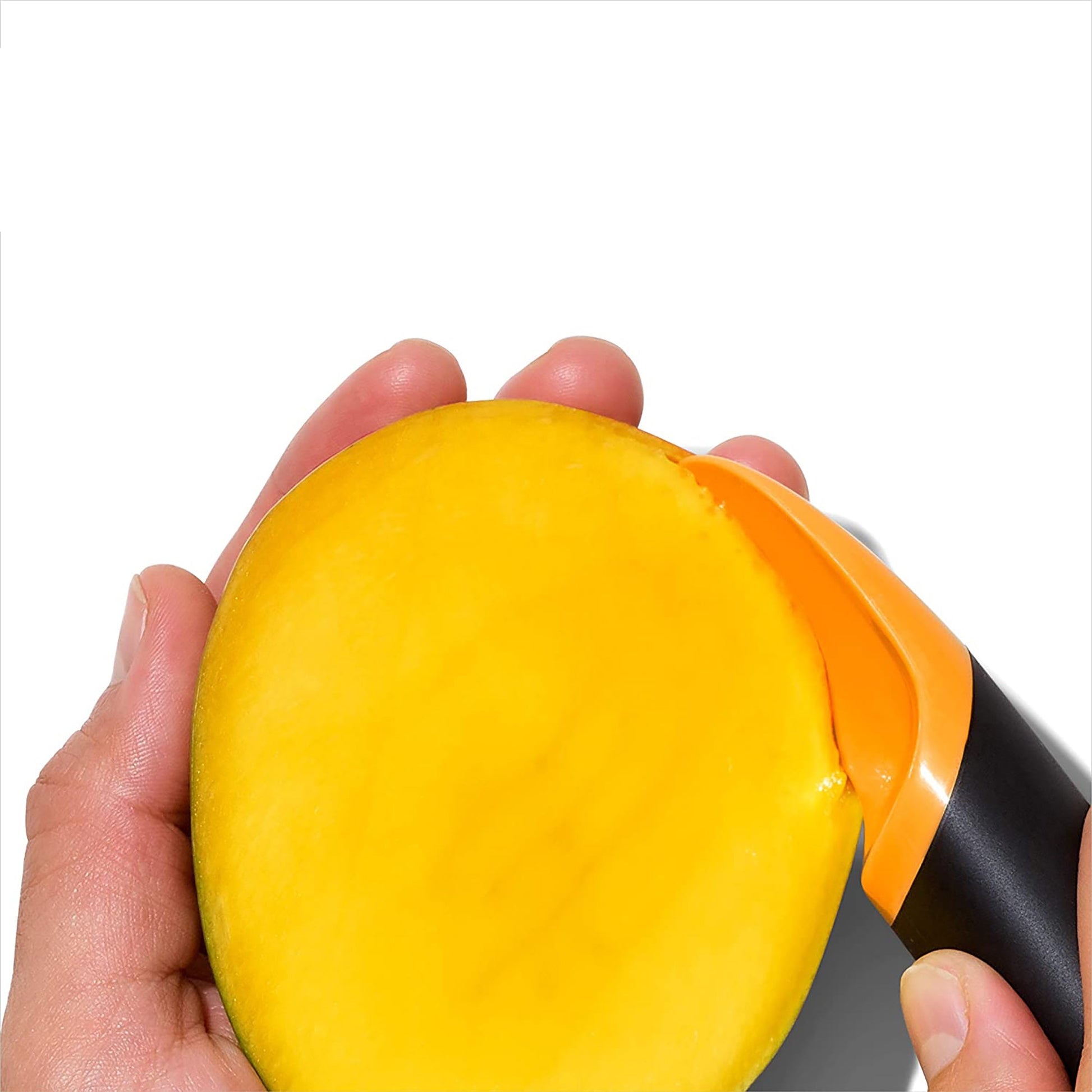 -This mango slicer with scoop is the all-in-one tool mango lovers need to make snacks, salsas, and smoothies simple. Our tool lets you slice, score, and scoop mangos with ease. Use the serrated blade to slice the fruit into two pieces, avoiding the pit. It is sharp enough to glide through the mango but safe to the touch. Then use the unique Scoop to efficiently remove the fruit from the skin. Or, slice or cube the mango right in the skin before scooping.