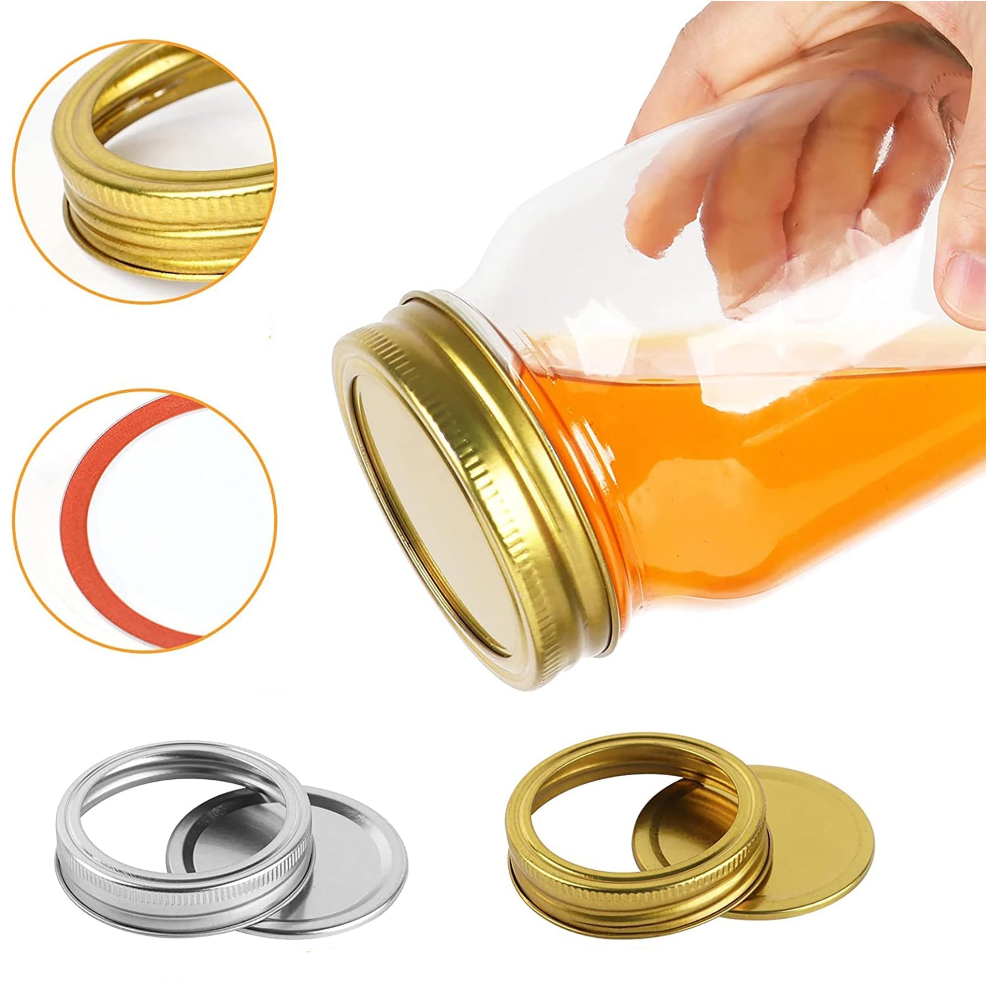 -18 Airtight Seal Lids: The corrosion-resistant metal lids with 12 silver lids and 6 gold lids, can be sealed tightly to keep your food fresh inside the jar. Each canning lid comes with a silicone sealing gasket to ensure sealing and is waterproof, and leak-proof.