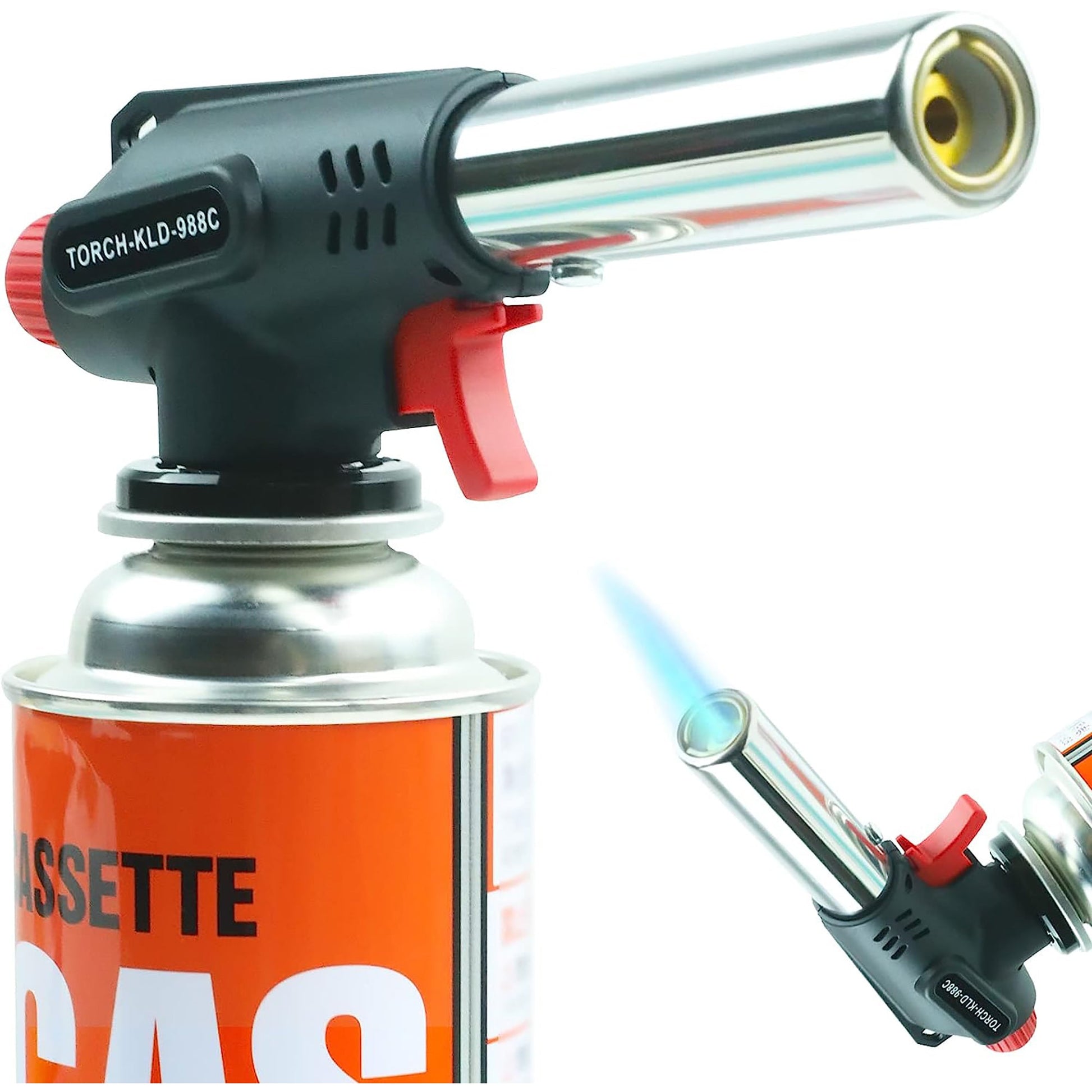 -Easy to Use and Carry: Only need 2 seconds to match with different sizes of butane fuel canisters. Just line the cylinder connector into the butane gas cartridge and push down slightly, then twist it clockwise till it is locked in place. Light Up with Piezo Ignition Technology: Just press to light the fire, easy to operate with the gas flow regulator and air flow control valve cooking food torch, can be flame intensity controlled, close the valve switch, and the flame goes off