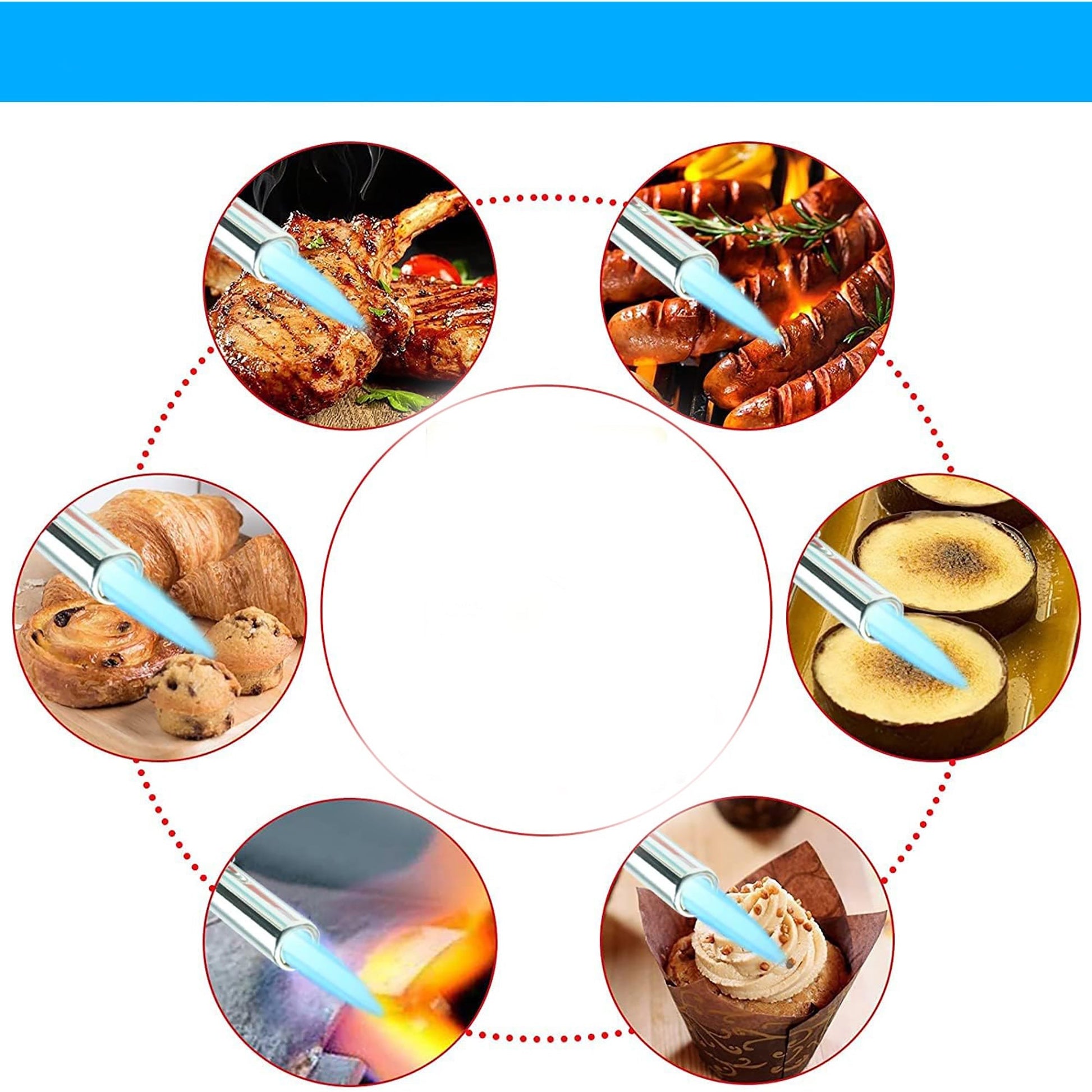 -Widely Used: Portable Multi-use for Home Cooks, DIY, Plumbers, and Camping. cooking torch suitable for professional and creative family cooks. It is widely used in the processing of delicious caramel desserts, meat barbecue, charring vegetables, glazing ham, cigar lighter, sous vide, small handicraft, Creme, Brulee, BBQ, Baking, and so on.