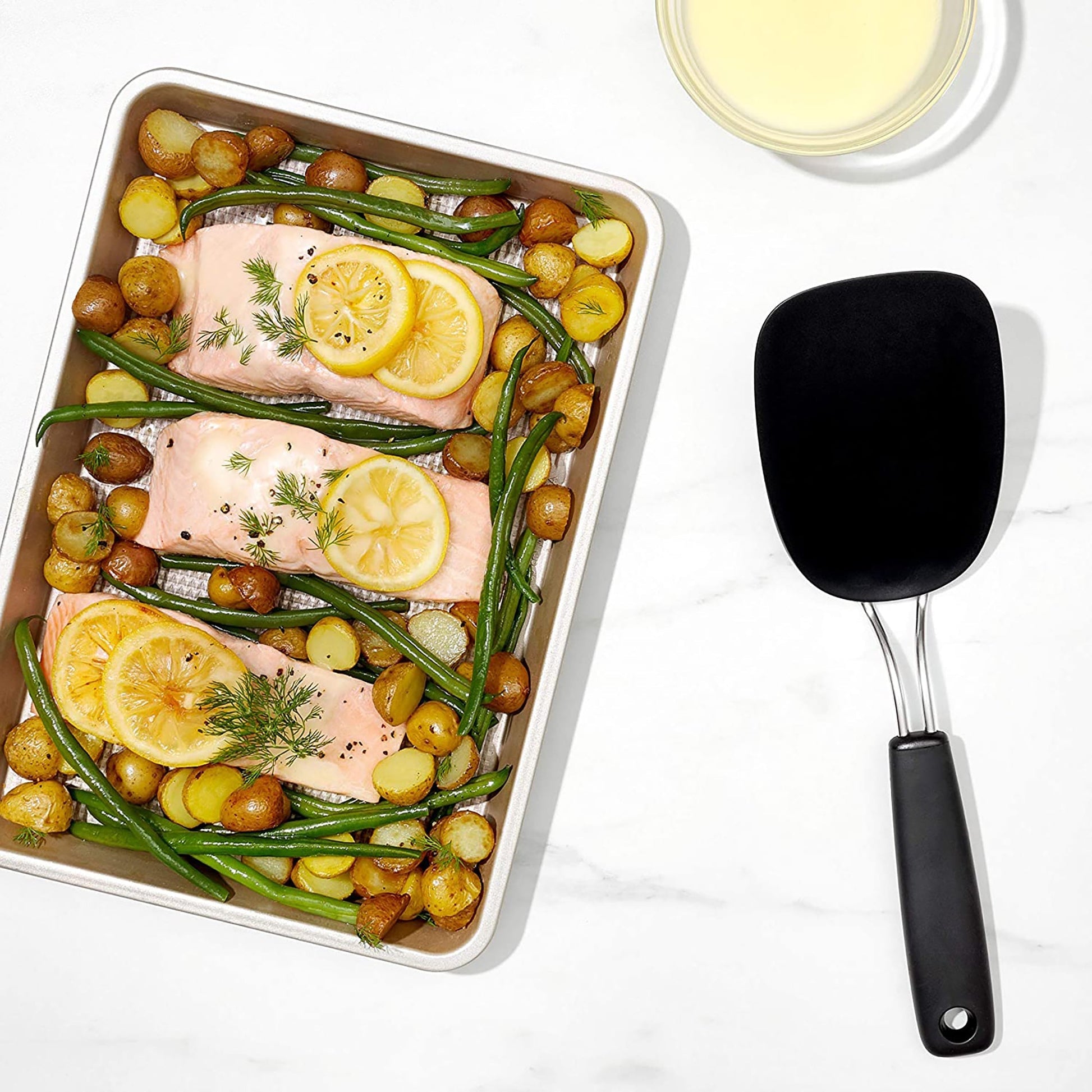 -Flexible nylon head easily slides beneath foods in saute pans.