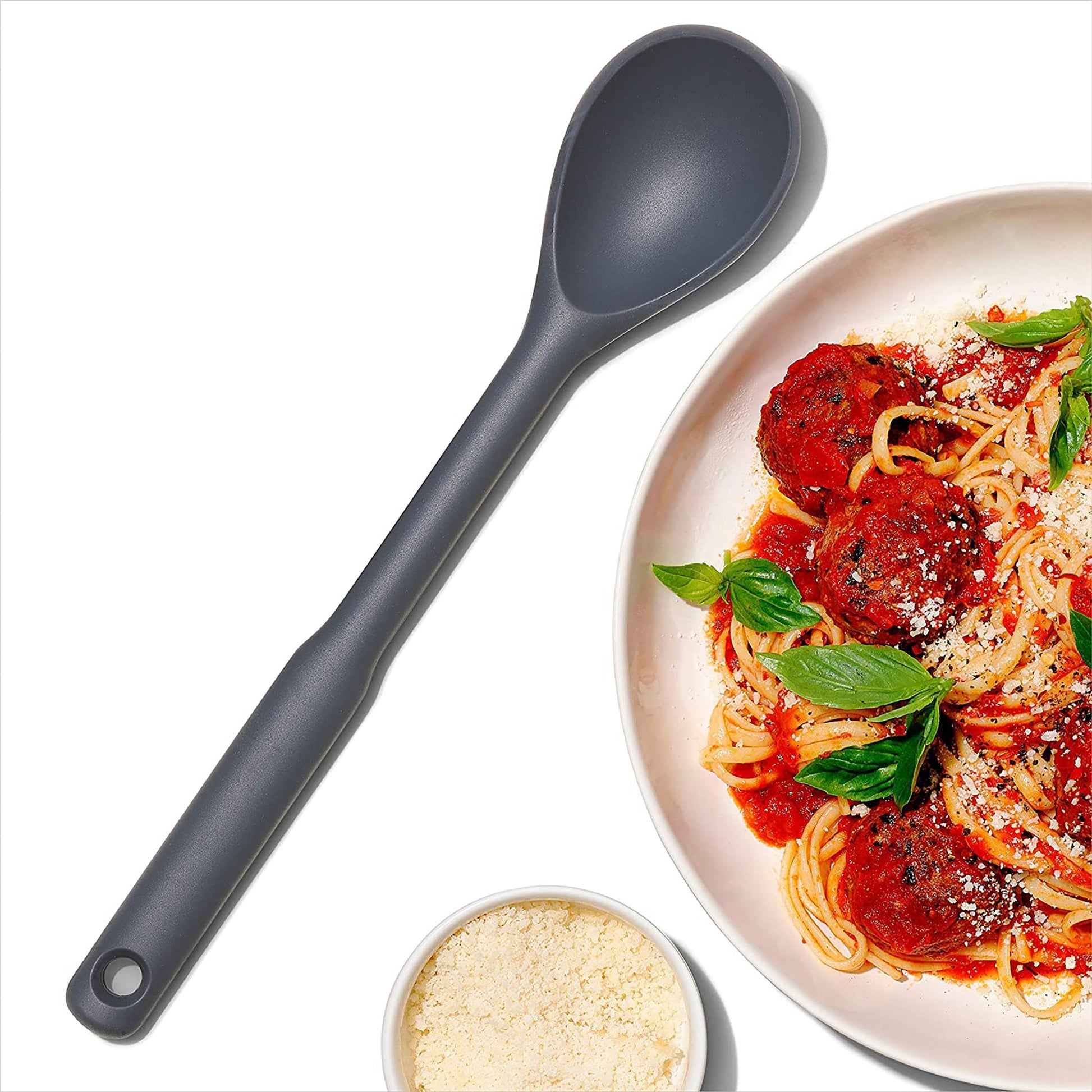 -The silicone spoon has a soft, non-slip grip and is comfortable in your hand, no matter how many helpings you serve. Heat-safe silicone is gentle on non-stick cookware and is dishwasher-safe, so cleanup is a breeze.