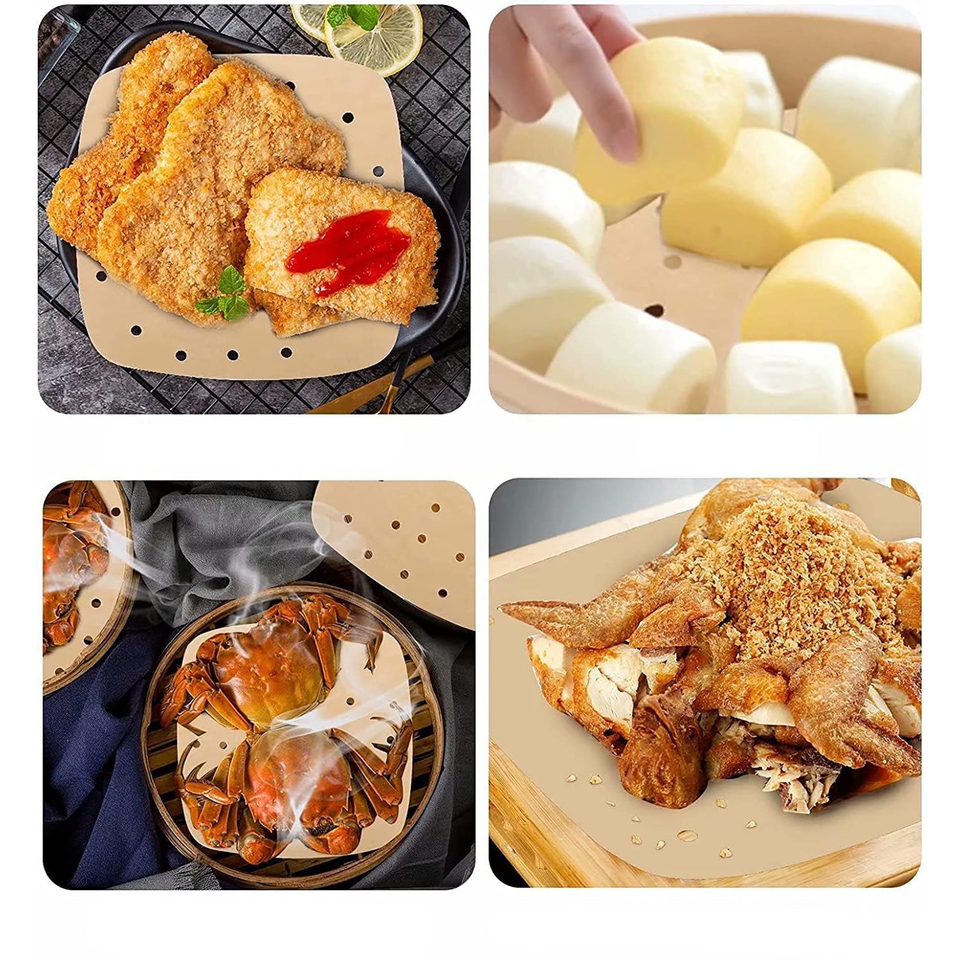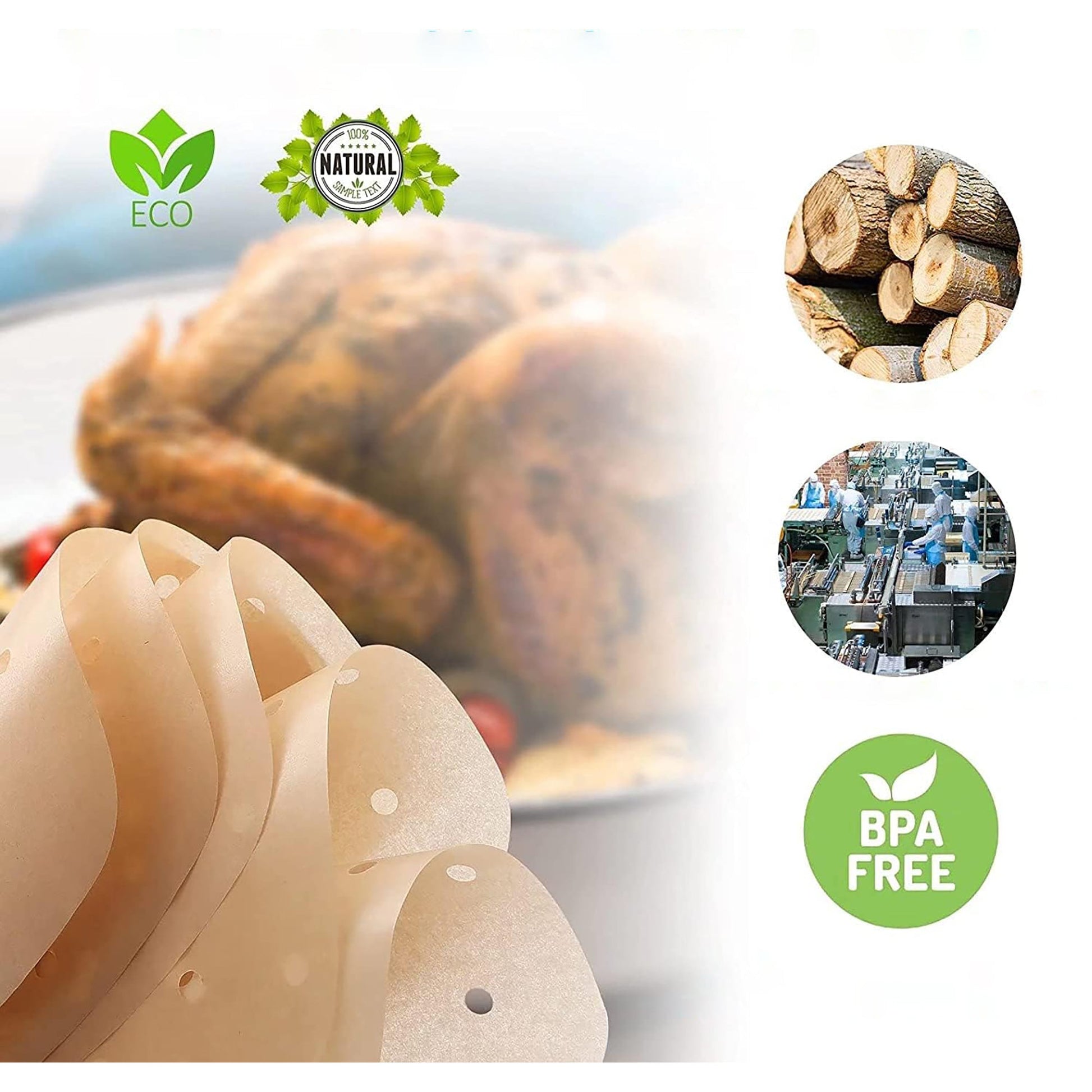 -Easy to Clean and Non-Stick: Our air fryer parchment paper made with nonstick food grade premium quality baking paper, will protect your air fryers and steaming basket from food residue, make clean up a breeze.