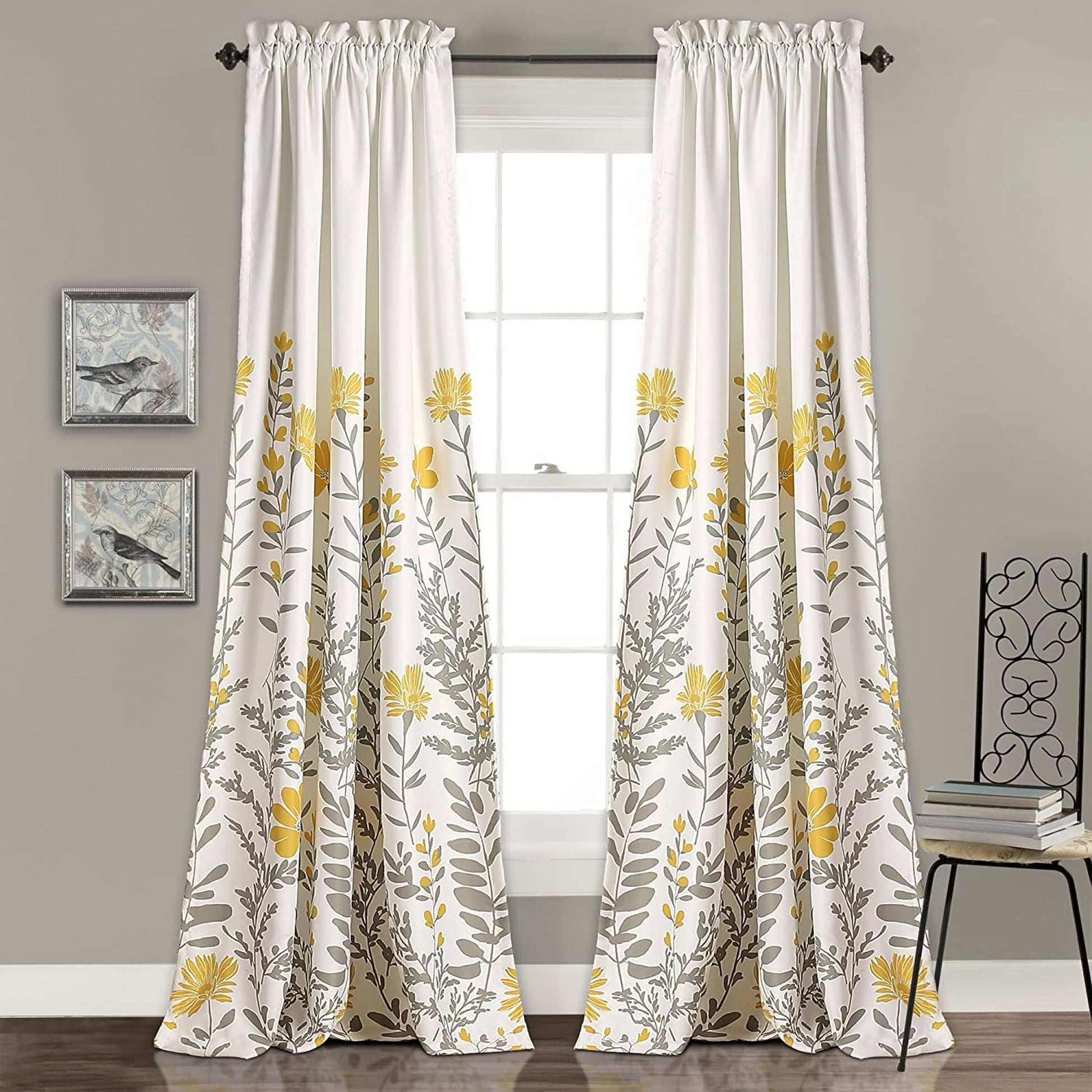 Room Darkening Curtains Floral Leaf Design Window Panel Drapes 84 x 52 - Yellow and Gray