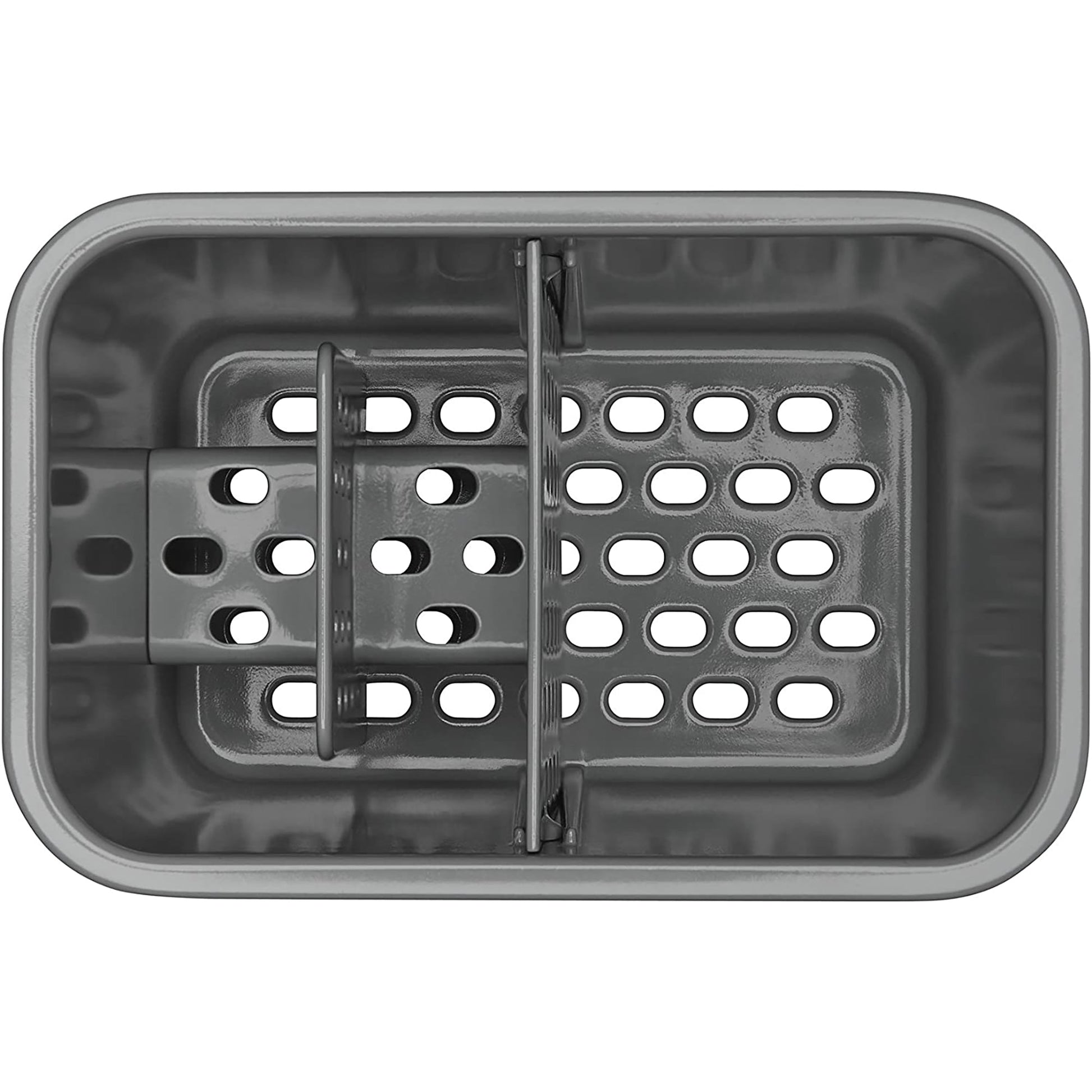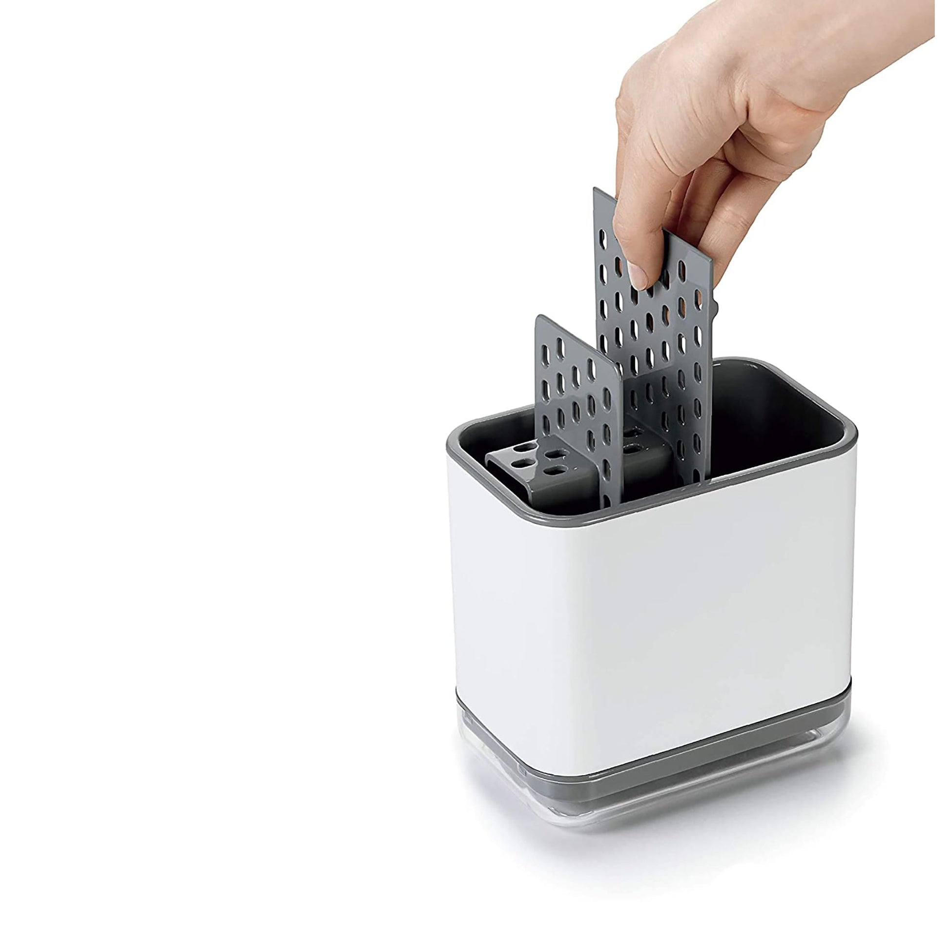 -Tackle handwashing dishes once and for all with a sink ware caddy that does double duty. This crock-style organizer has two compartments designed for squeaky clean storage. The first compartment stores brush and other cleaning tools upright for easy access; the second has an elevated sponge tray to keep two sponges dry and super handy. Both are perforated for airflow and to wick water away. A removable drip tray with a built-in spout comes apart for easy cleaning.