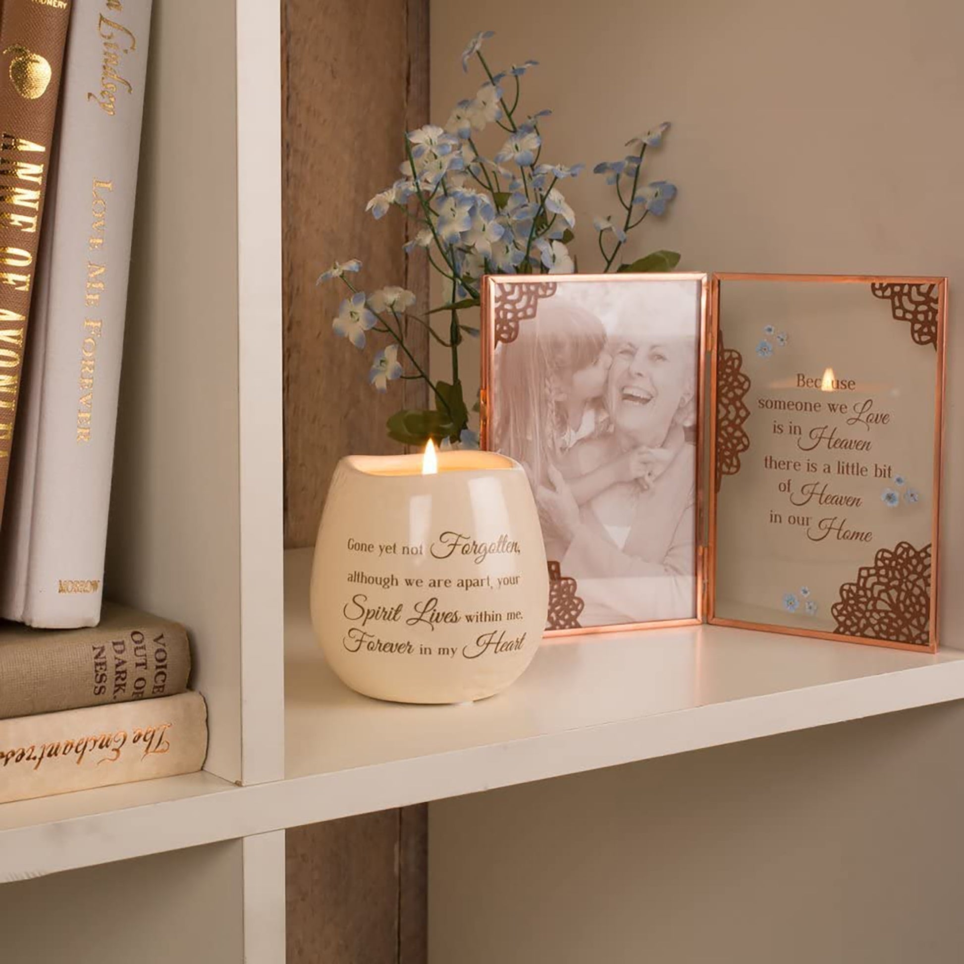 -In-House Design: Gone Yet Not Forgotten, Although We Are Apart, Your Spirit Lives Within Me, Forever In My Heart - text is printed onto the front of the candle holder.