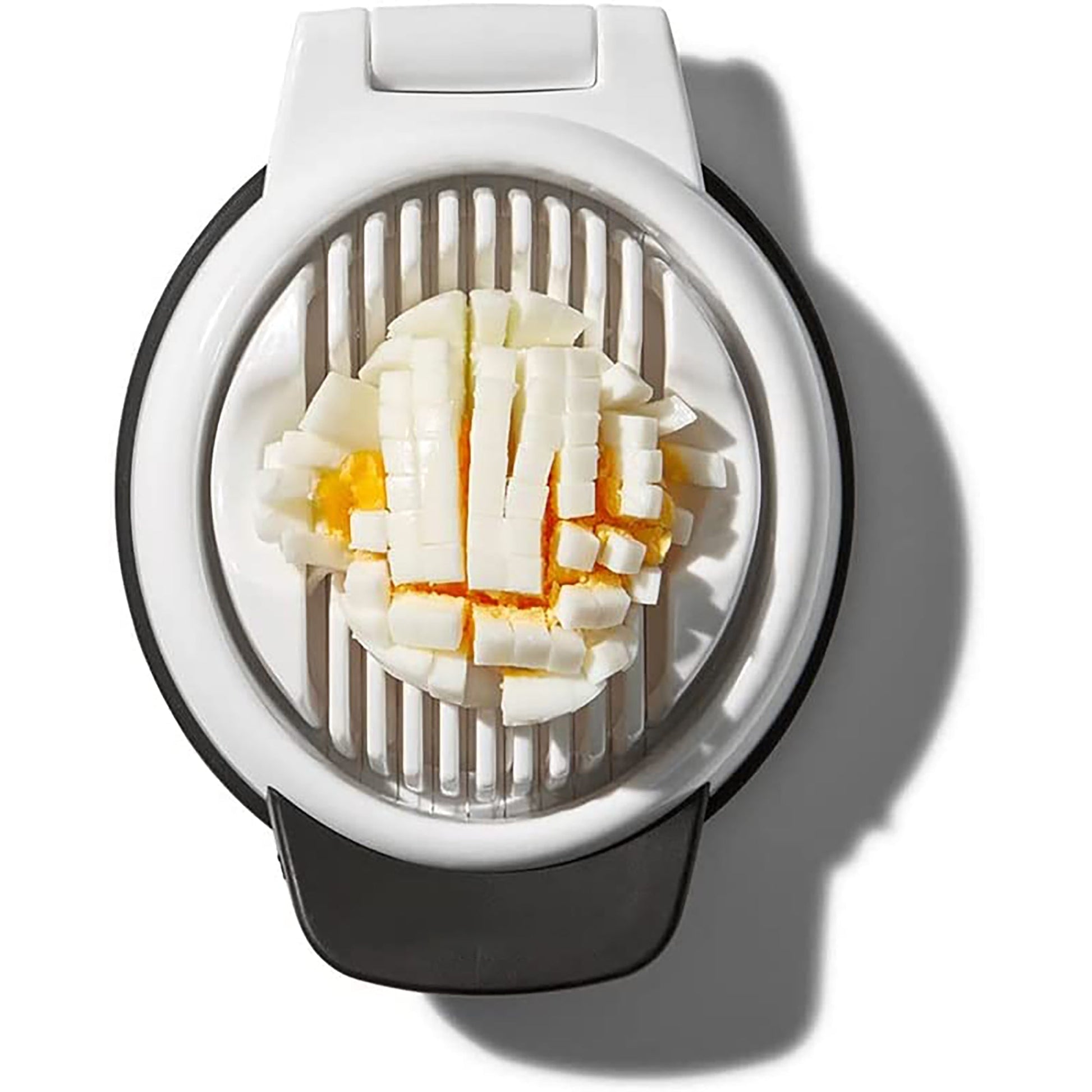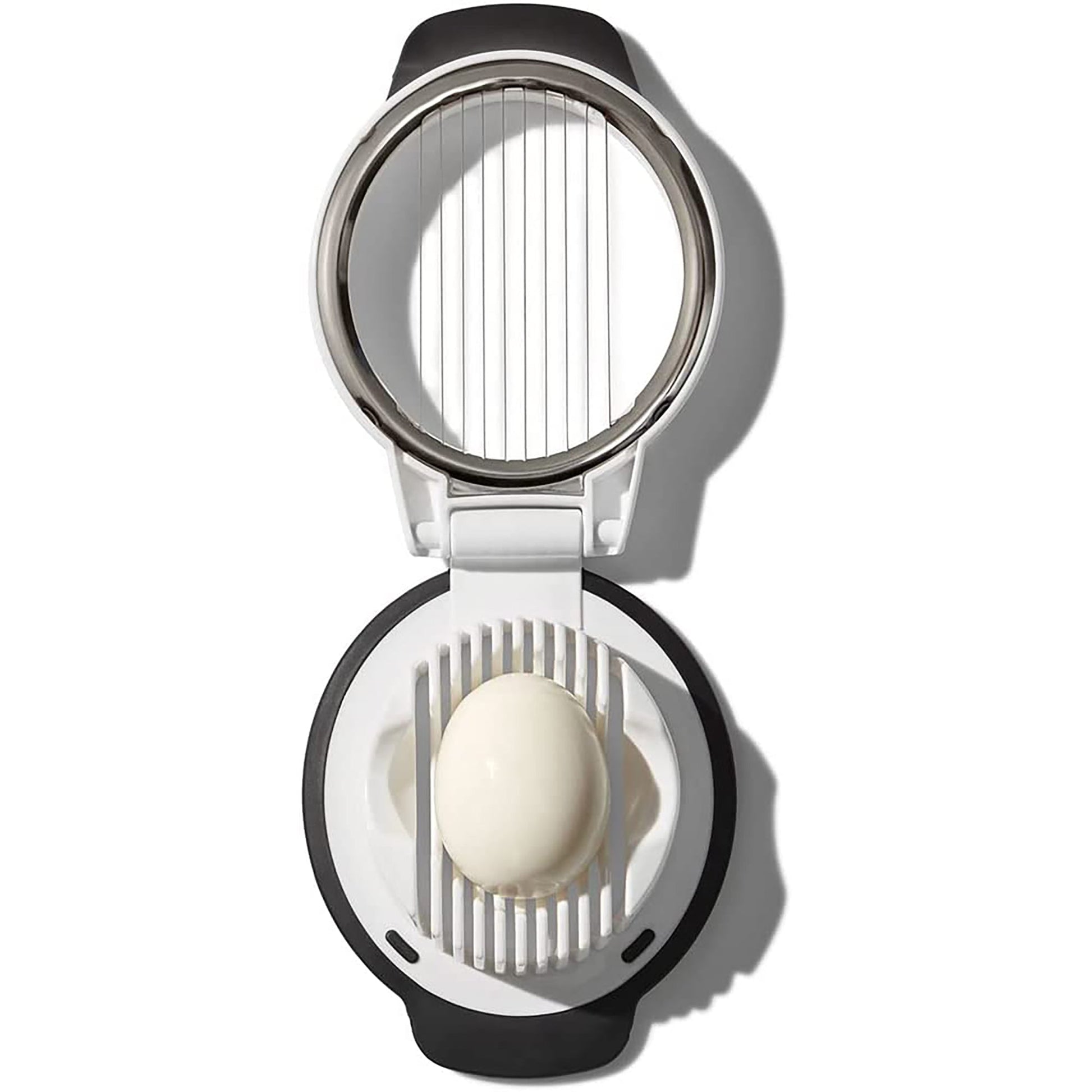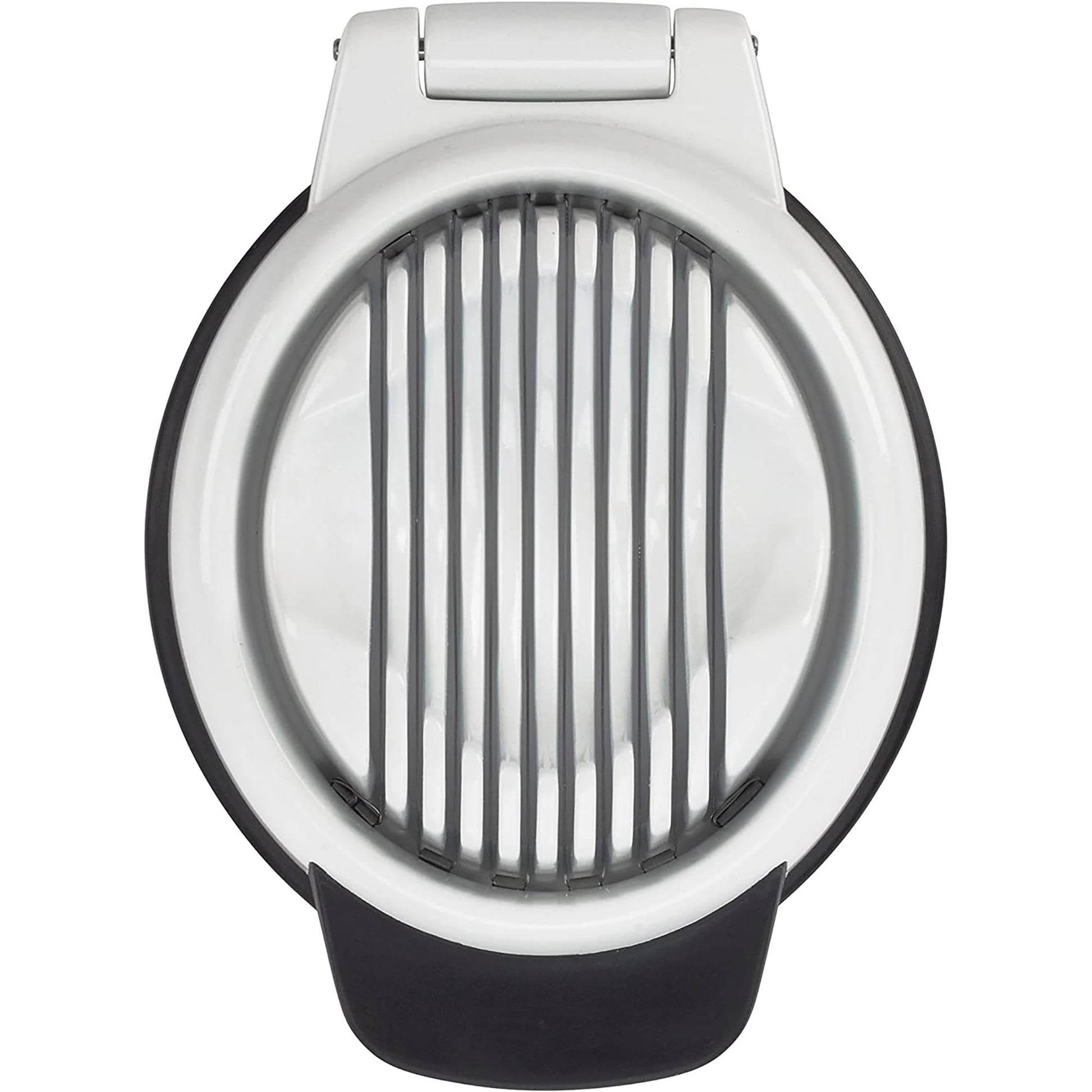 -Slice faster using this Egg Slicer. A non-slip base prevents movement on a plate or cutting board surface. This slicer has stainless steel wires to produce finely sliced eggs, mushrooms, and other soft fruit and vegetables for use in salads.