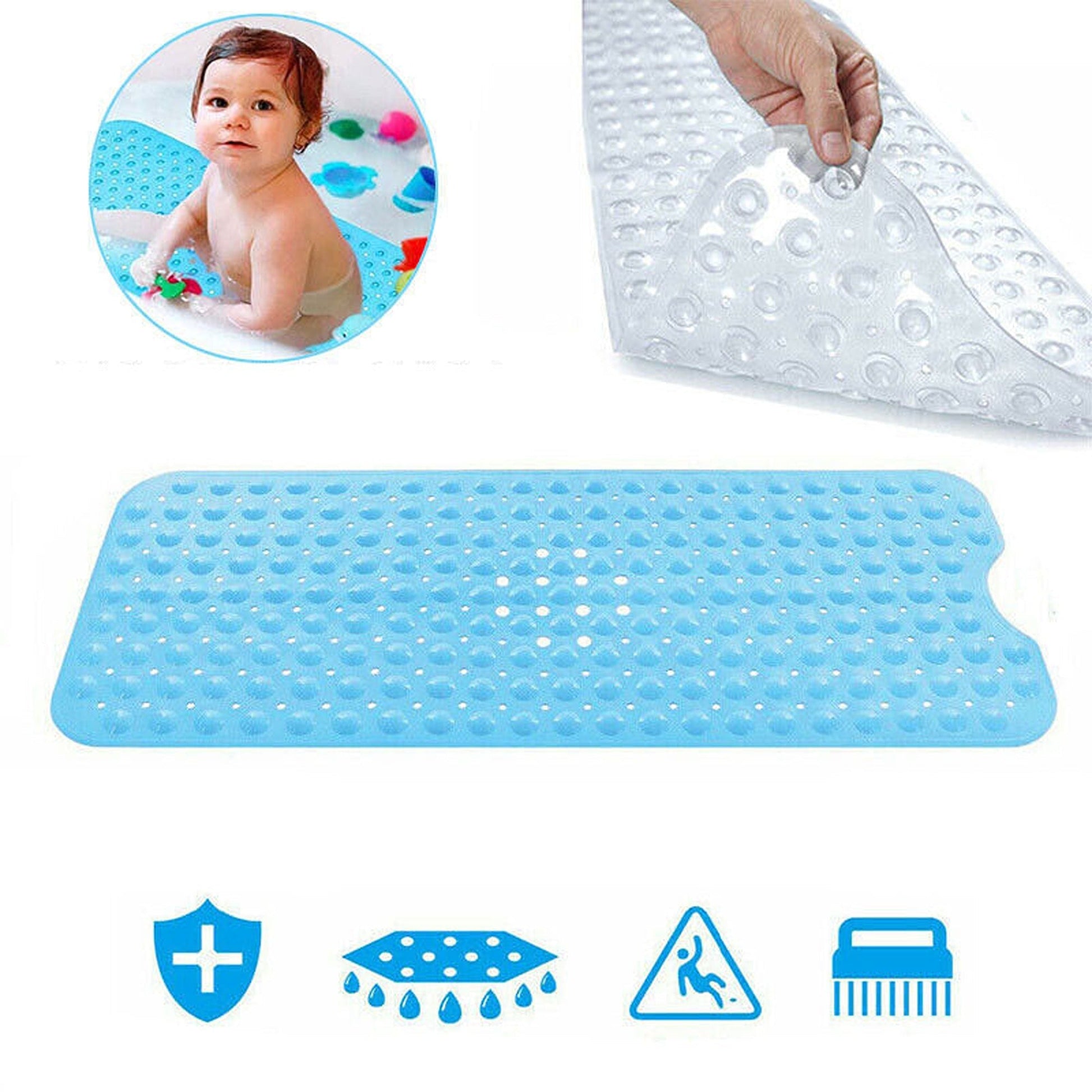 -Perfect shape and soft design: our bathtub mat has a textured surface for comfortable safety. Relax with the comfort of the small raised bubbles gently massaging your weary feet. This shower mat comes in blue which gives a contemporary look to any shower room.