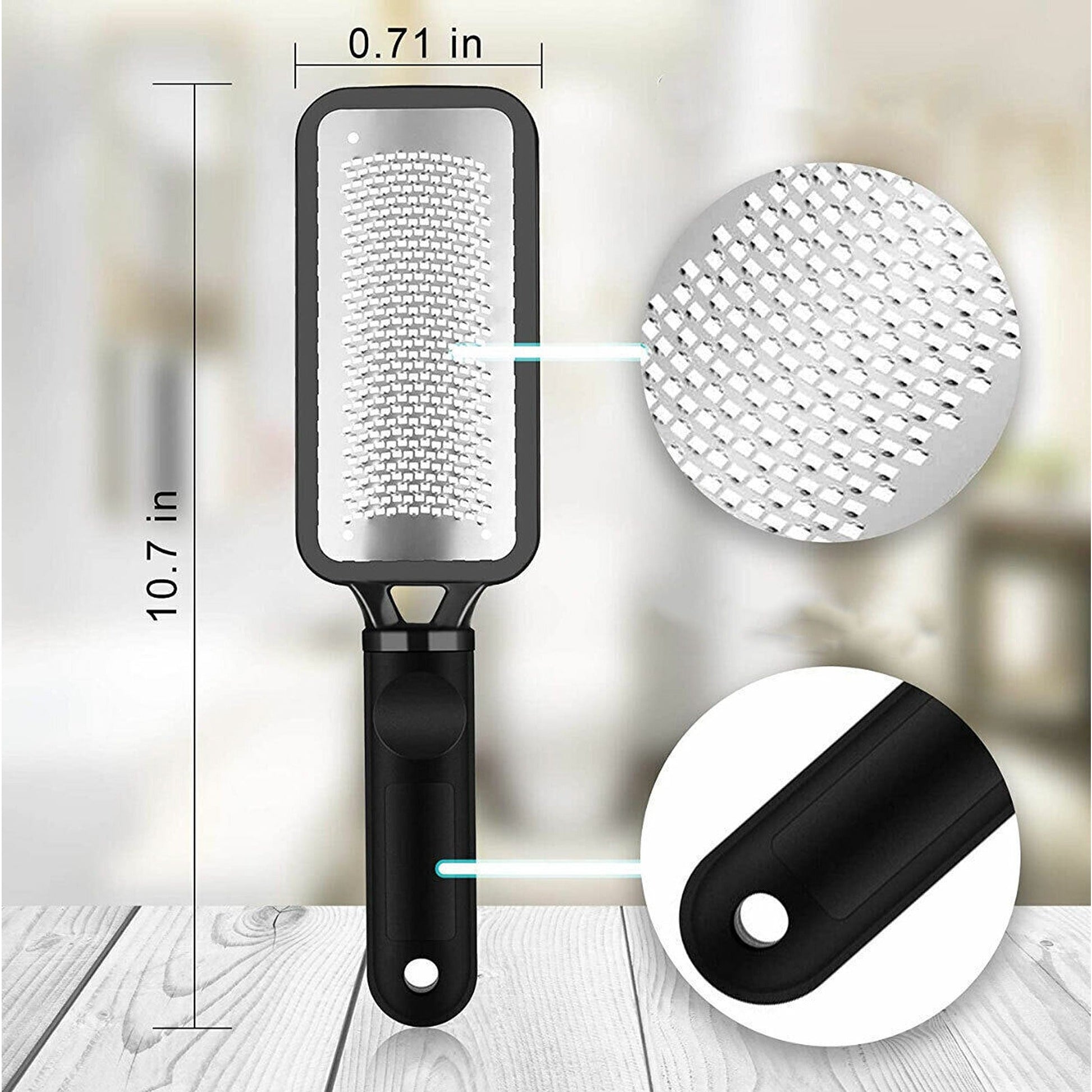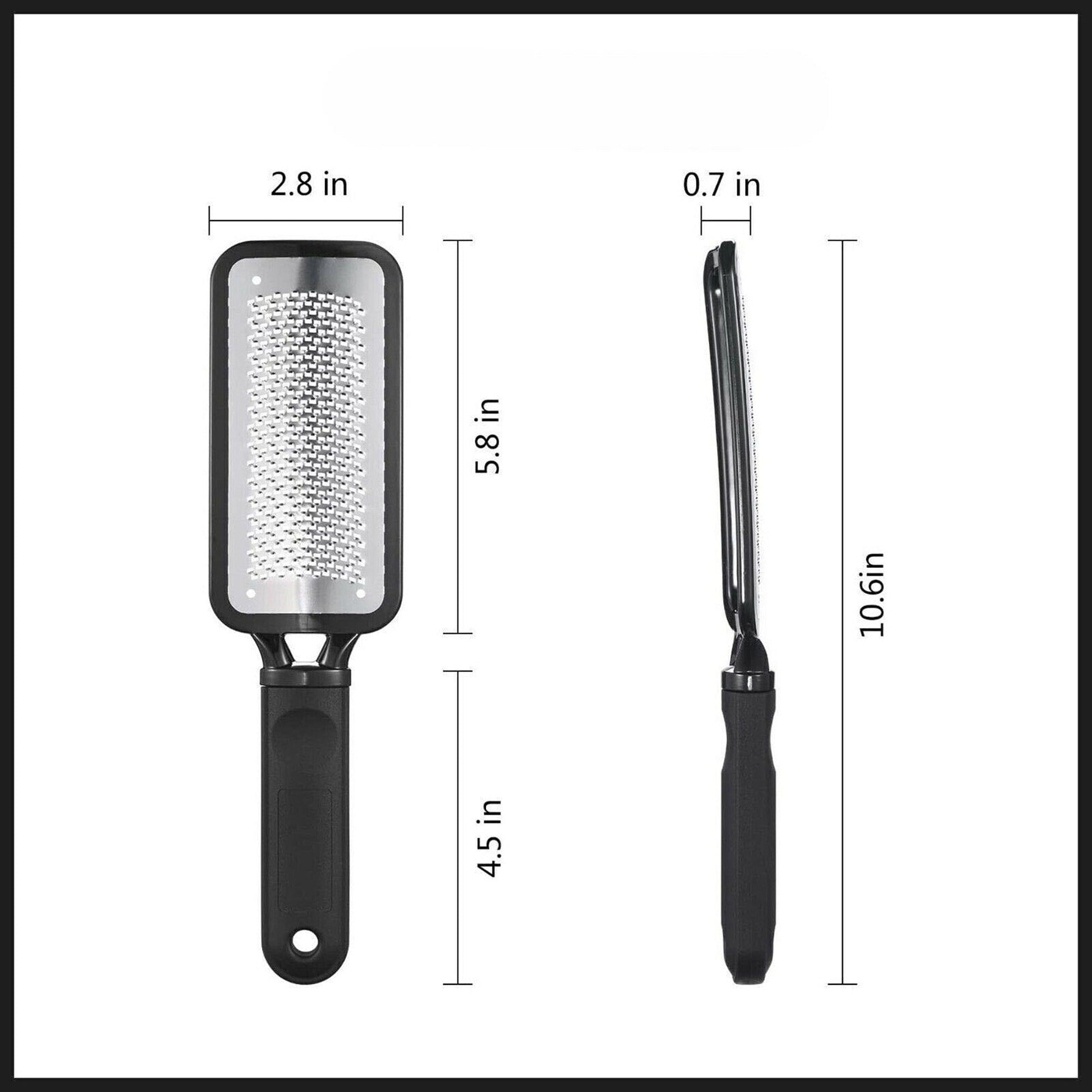 -Remove hard skin and achieve soft feet and heels effectively and quickly with our extra-large stainless steel foot rasp. The file measures a whopping 13cm x 7cm, providing excellent coverage over your heel and foot, and is easy to hold and use. Measures 27cm in length.